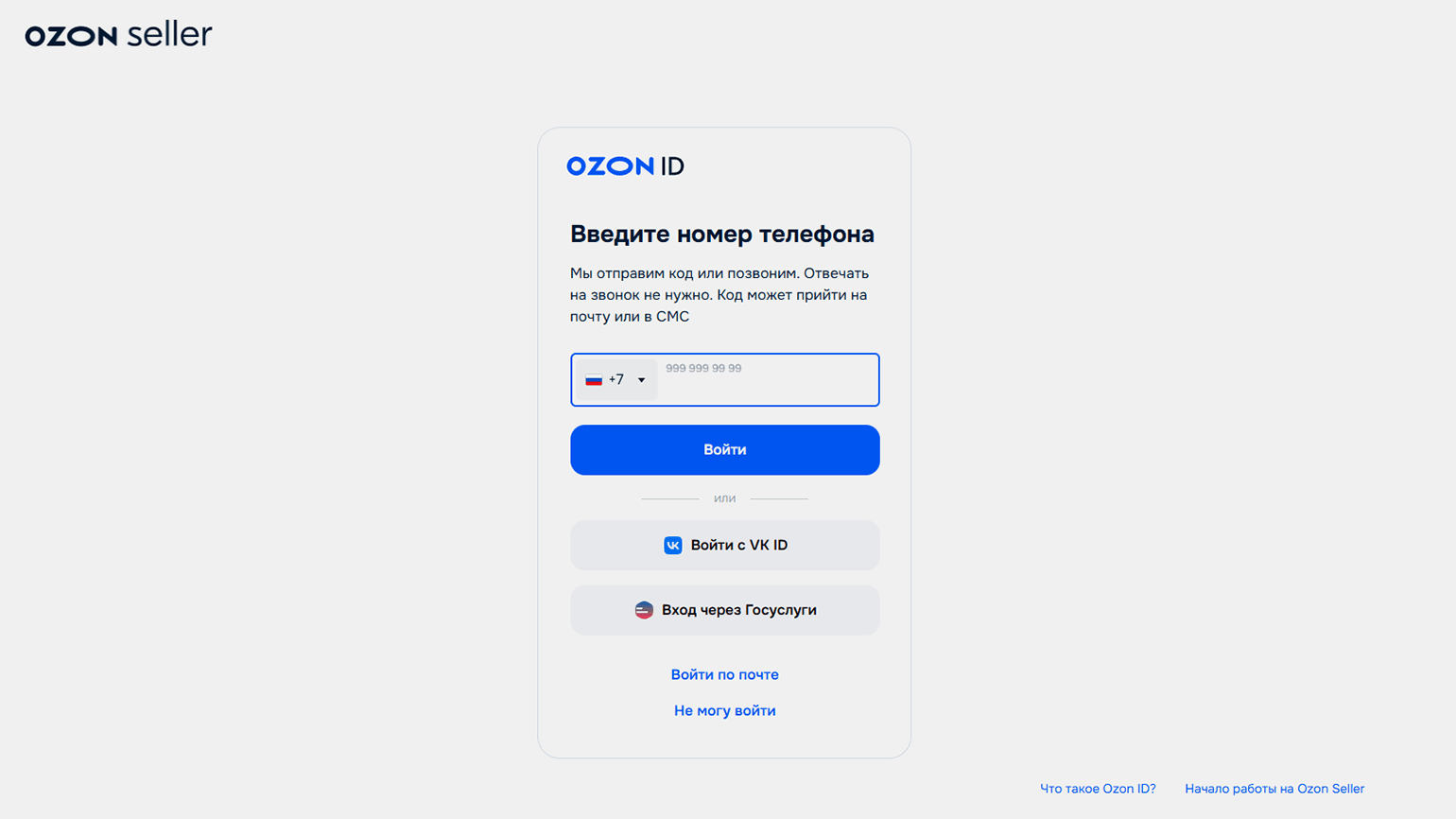 Регистрация. Для регистрации нужно выбрать страну, из которой вы продаёте, и создать Ozon ID. Сделать это можно по номеру телефона. Его придётся подтвердить: получить код и ввести его на сайте.
