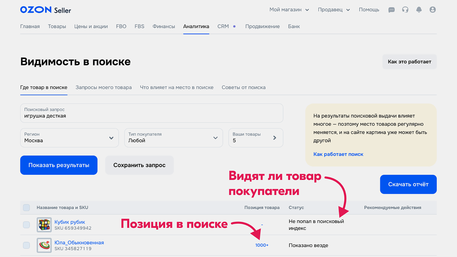 Раздел «Где товар в поиске» показывает, видны ли ваши позиции в поисковой выдаче Ozon и на каких местах они находятся. С его помощью можно проверить выдачу по конкретным запросам, в разных городах, а также на разных устройствах и для разных типов покупателей — например, физических лиц или компаний.