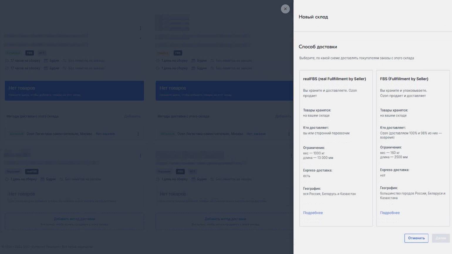Ещё есть модель экспресс-доставки. Она работает как realFBS, но вы должны собирать заказ не больше часа и доставлять в срок до трёх часов с момента его получения. Доставлять можно своими силами, через партнёров Ozon и сторонние службы. Эта схема подходит только для работы в крупных городах.