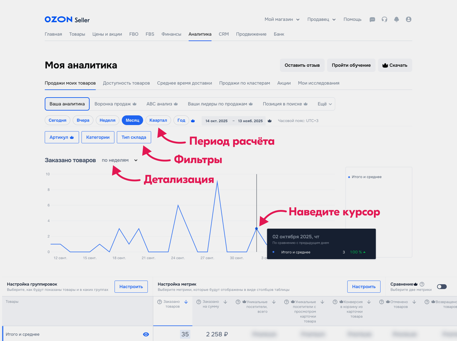 Во всех трёх инструментах графики можно модифицировать — выбирать один товар или группу, менять период расчёта, добавлять метрики или сравнивать их.