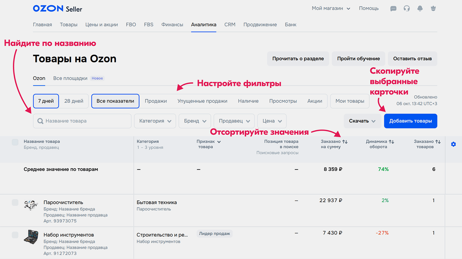 - Для анализа данных можно использовать не только внутренние данные Ozon, но и внешние сервисы. Они покажут, например, какие товары в категории продавать выгоднее всего. В Skillbox Media есть подборка сервисов аналитики для опытных и начинающих селлеров.