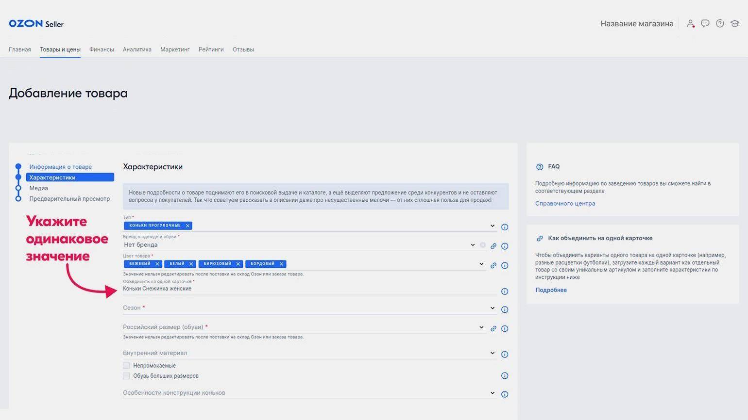 Карточки можно объединять в одну — например, чтобы дать покупателю возможность выбрать цвет, размер или объём упаковки. Для этого нужно создать разные карточки для каждого продукта и в каждой из них в поле «Объединить на одной карточке» указать одинаковое значение — например, название.