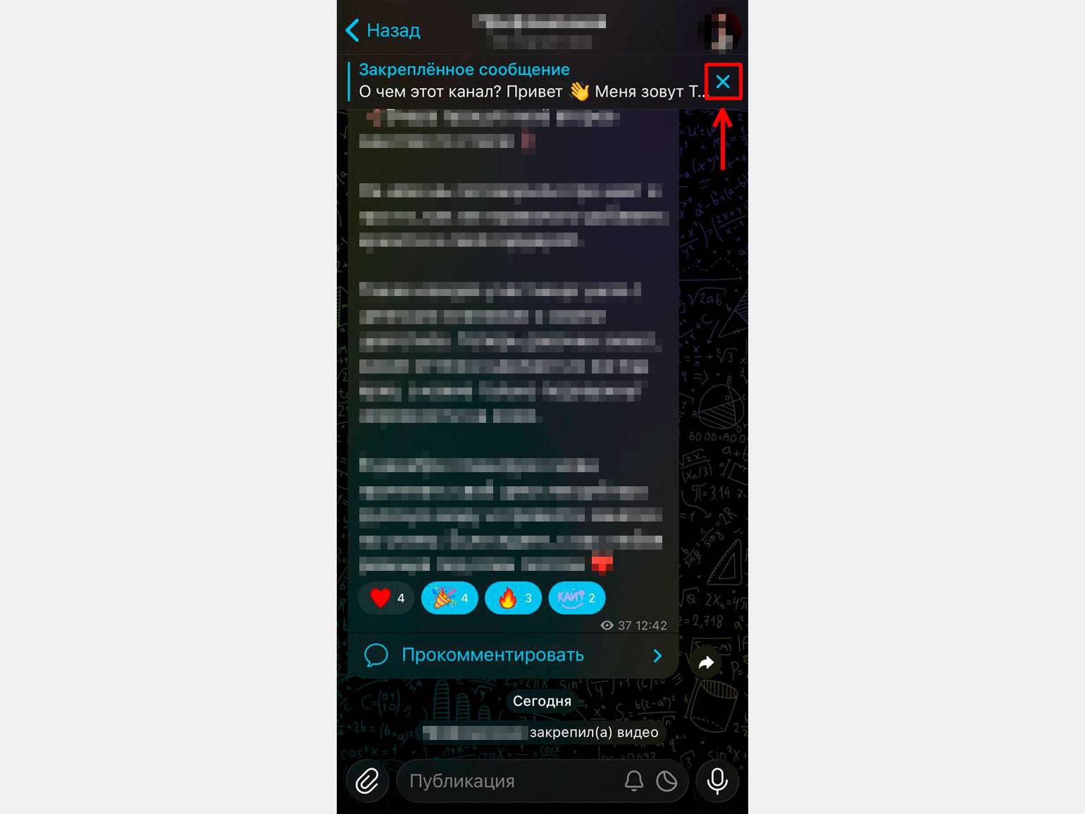 На смартфоне. Откройте приложение и найдите нужный чат или канал. Откройте его. Если в чате или канале только одно закреплённое сообщение, то его можно открепить, нажав на крестик в правом углу.