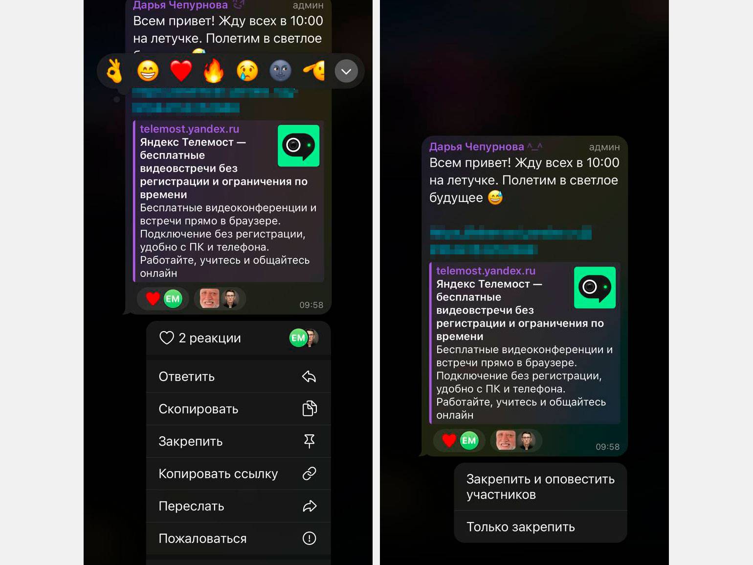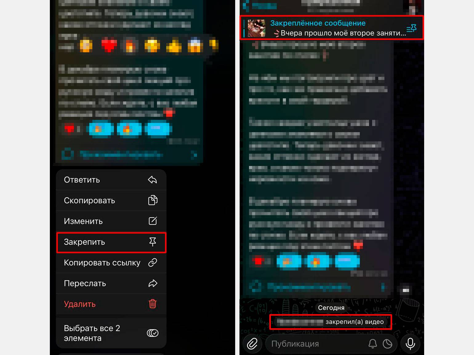 Чтобы закрепить сообщение в канале, выберите нужное сообщение, зажмите его и в меню нажмите «Закрепить». Сообщение отобразится в верхней части экрана, а в канале появится уведомление о закреплении сообщения.