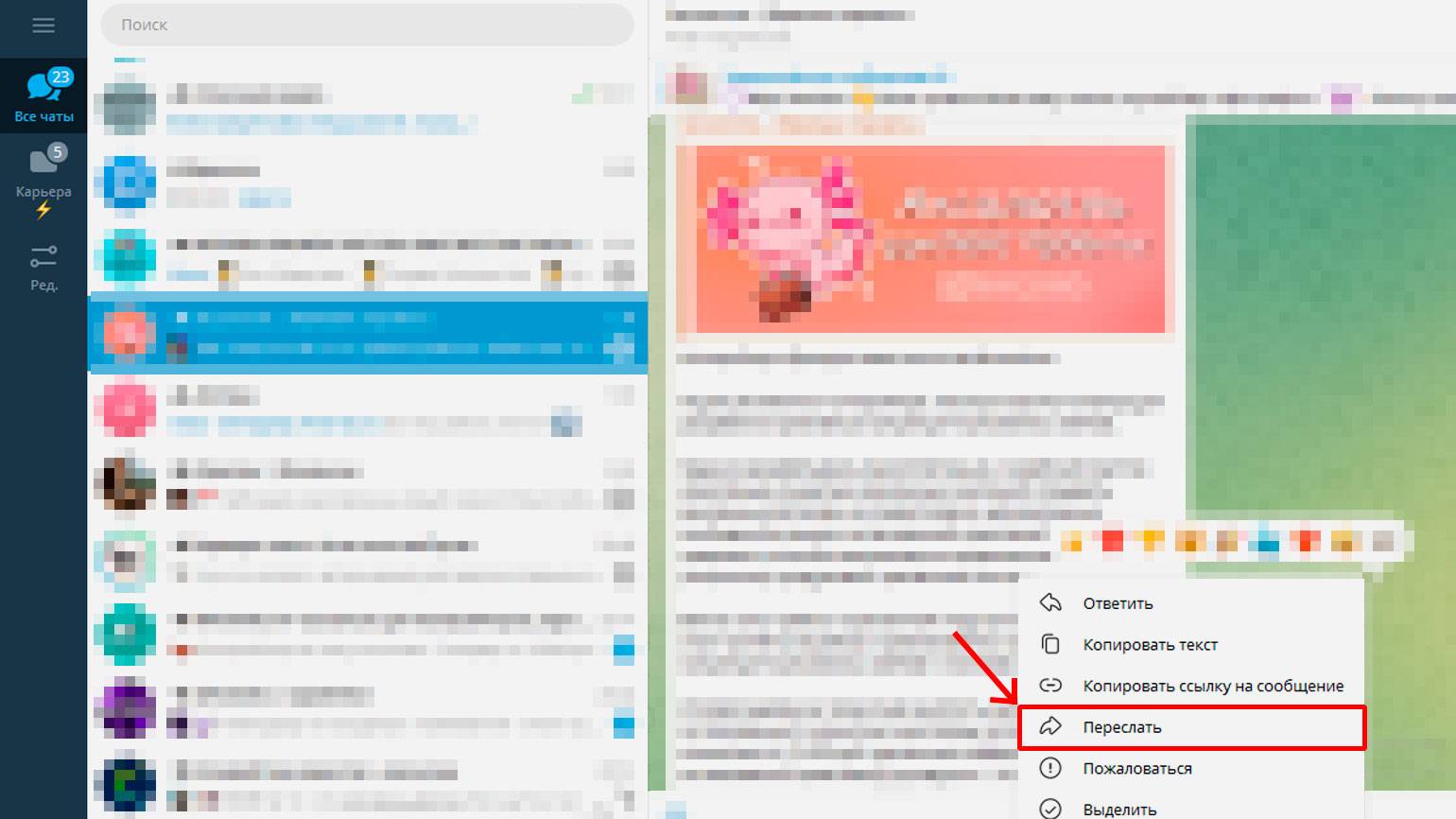 На ПК и ноутбуке. Сначала разберём, как закреплять сообщения в личном чате. Откройте Telegram и зайдите в нужный чат. Найдите сообщение, которое хотите закрепить, наведите курсор на него и кликните по нему правой кнопкой мыши. Откроется контекстное меню. В списке выберите пункт «Закрепить», или «Pin».