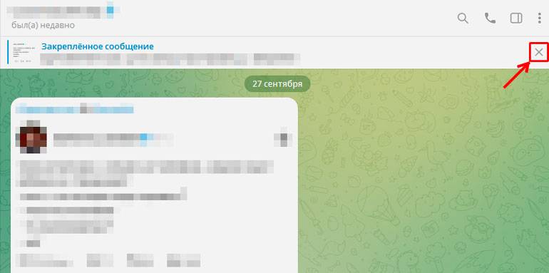 На ПК и ноутбуке. Откройте приложение и зайдите в нужный чат или канал. Вверху вы увидите закреплённое сообщение или значок списка закреплённых сообщений. Если в чате или канале только одно закреплённое сообщение, то его можно открепить, просто нажав на крестик в правом углу.