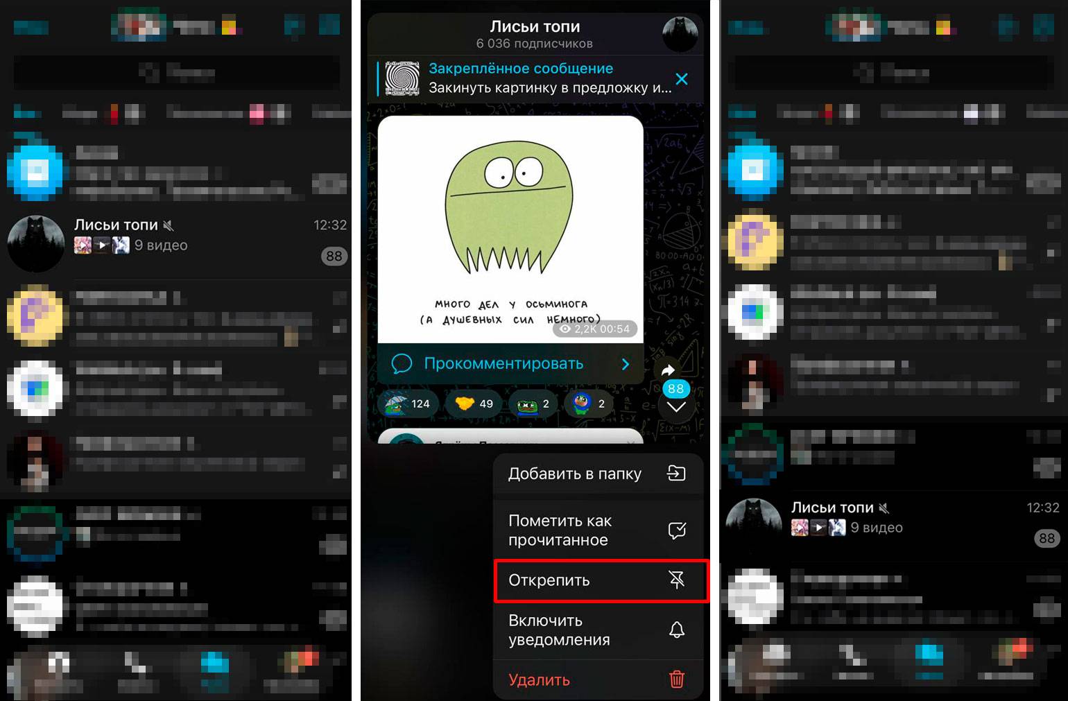 Когда информация перестала быть актуальной или появилось что-то более важное, может понадобиться открепить сообщение, чат или канал. Ниже рассмотрим подробнее, как это сделать.