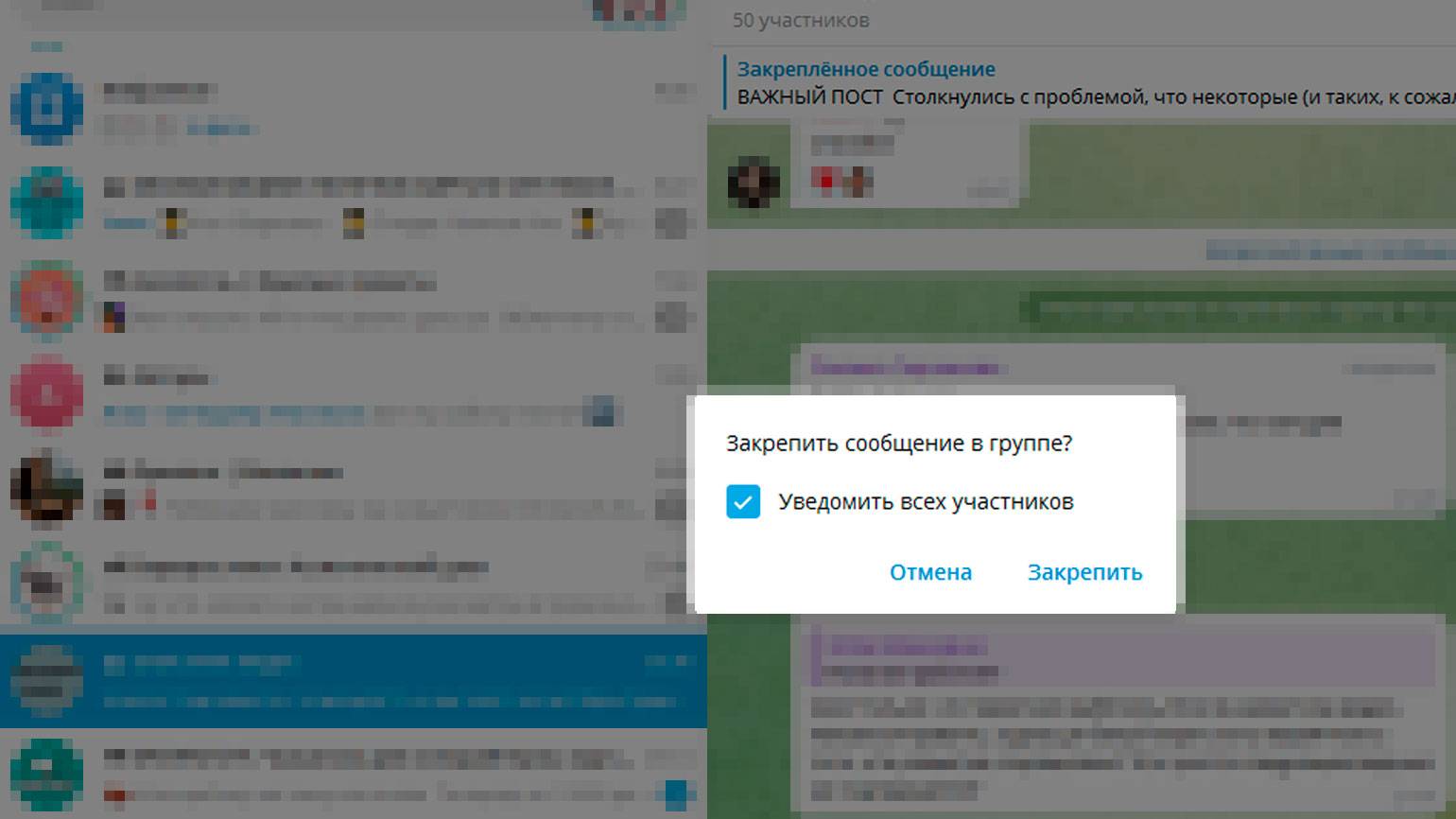 В групповом чате сообщения закрепляют по тому же принципу. Если вы закрепляете сообщение в групповом чате, то после выбора команды «Закрепить» появится всплывающее окно с вопросом: «Уведомить всех участников?» Если вы хотите, чтобы все участники группового чата получили уведомление о закрепе, то поставьте галочку и нажмите «Закрепить». Если нет, то сразу нажимайте на кнопку «Закрепить».