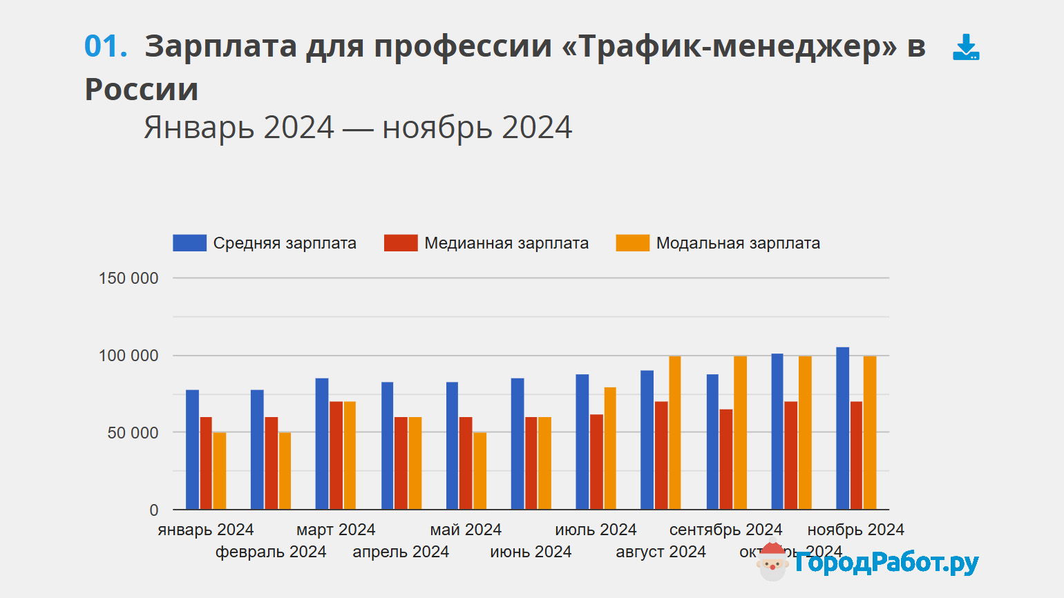 Менеджер по трафику. По данным портала «Город Работ», в октябре 2024 года средняя зарплата трафик-менеджеров составила 101 606 рублей. При этом зарплата в этой сфере постоянно растёт. Так, в январе 2024 года менеджеры по трафику в среднем зарабатывали 78 065 рублей.