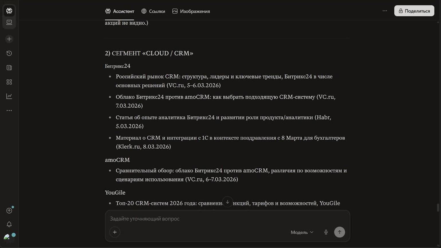 В Perplexity можно использовать несколько моделей — ChatGPT, Gemini, Claude, отмечает управляющий партнёр агентства Articul Дмитрий Фролов. Perplexity удобен для исследований и проверки фактов, считает главный редактор «Студии Чижова» Максим Ромаданов.
