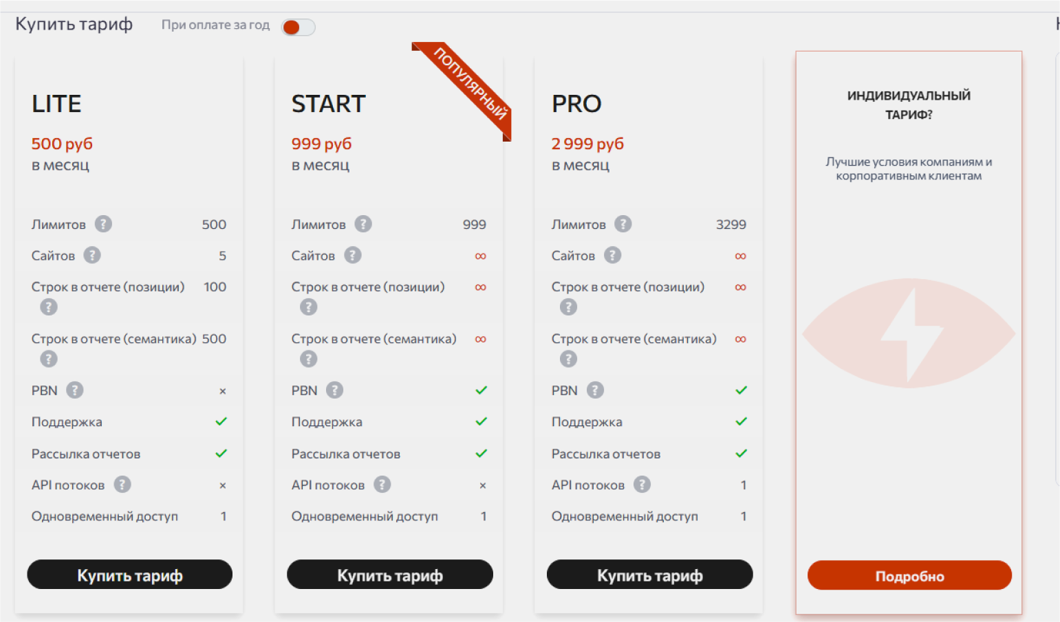- Чтобы зарегистрироваться в сервисе, нужен email и адрес вашего сайта. Доступ платный, стоимость тарифов — от 500 рублей в месяц. Есть пробный период сроком на 7 дней.