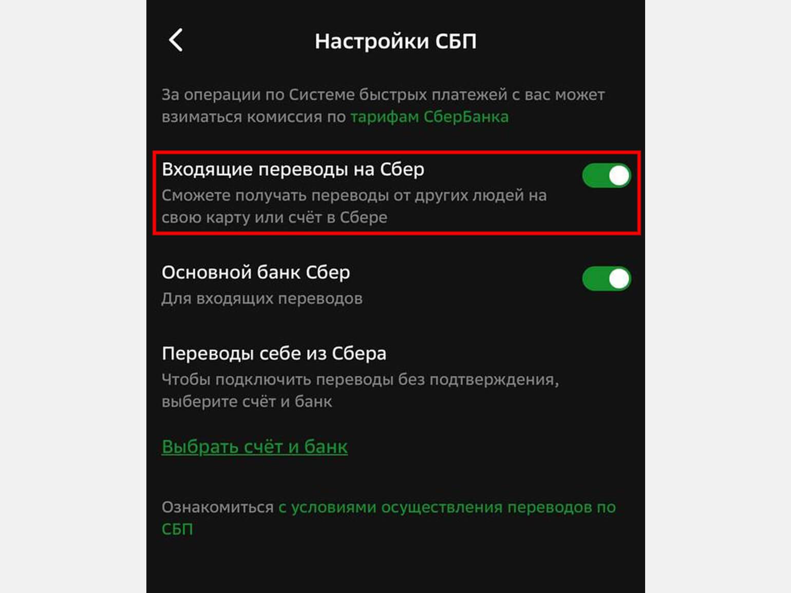 - Активируйте услугу, передвинув ползунок «Входящие переводы» вправо.