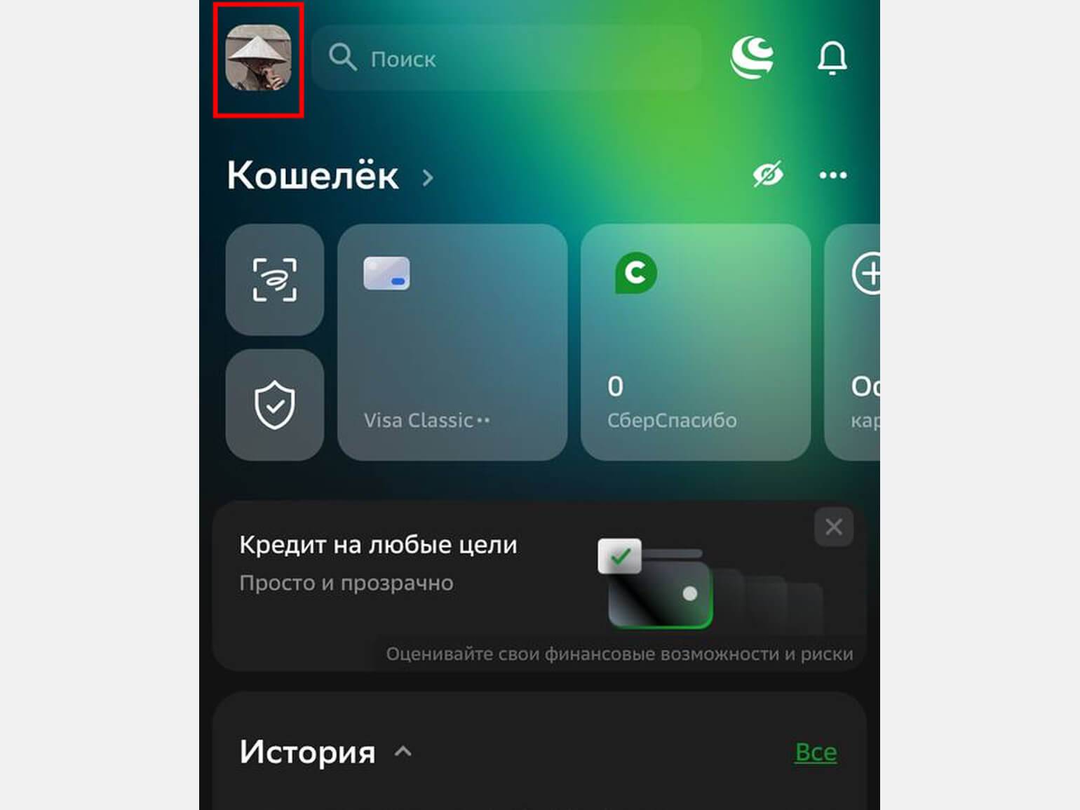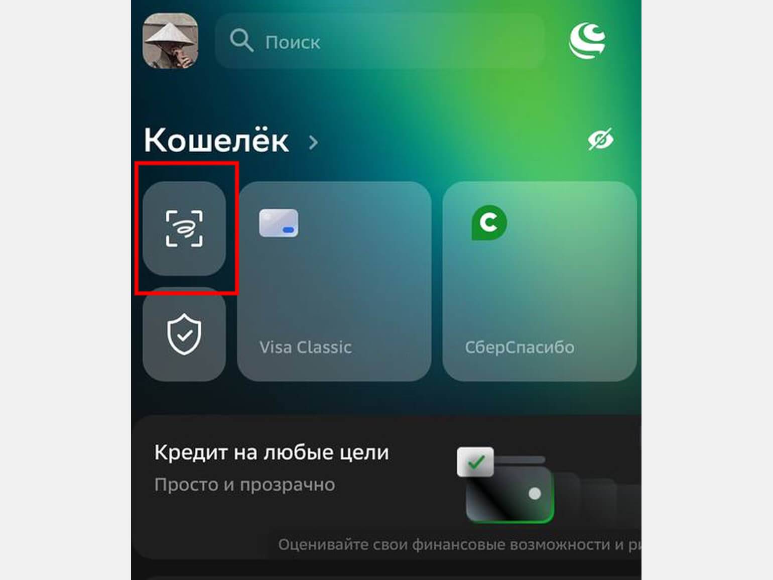 - Нажмите на значок QR-кода, расположенный слева от информации о ваших счетах.
