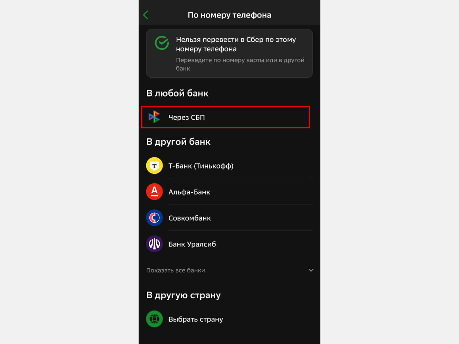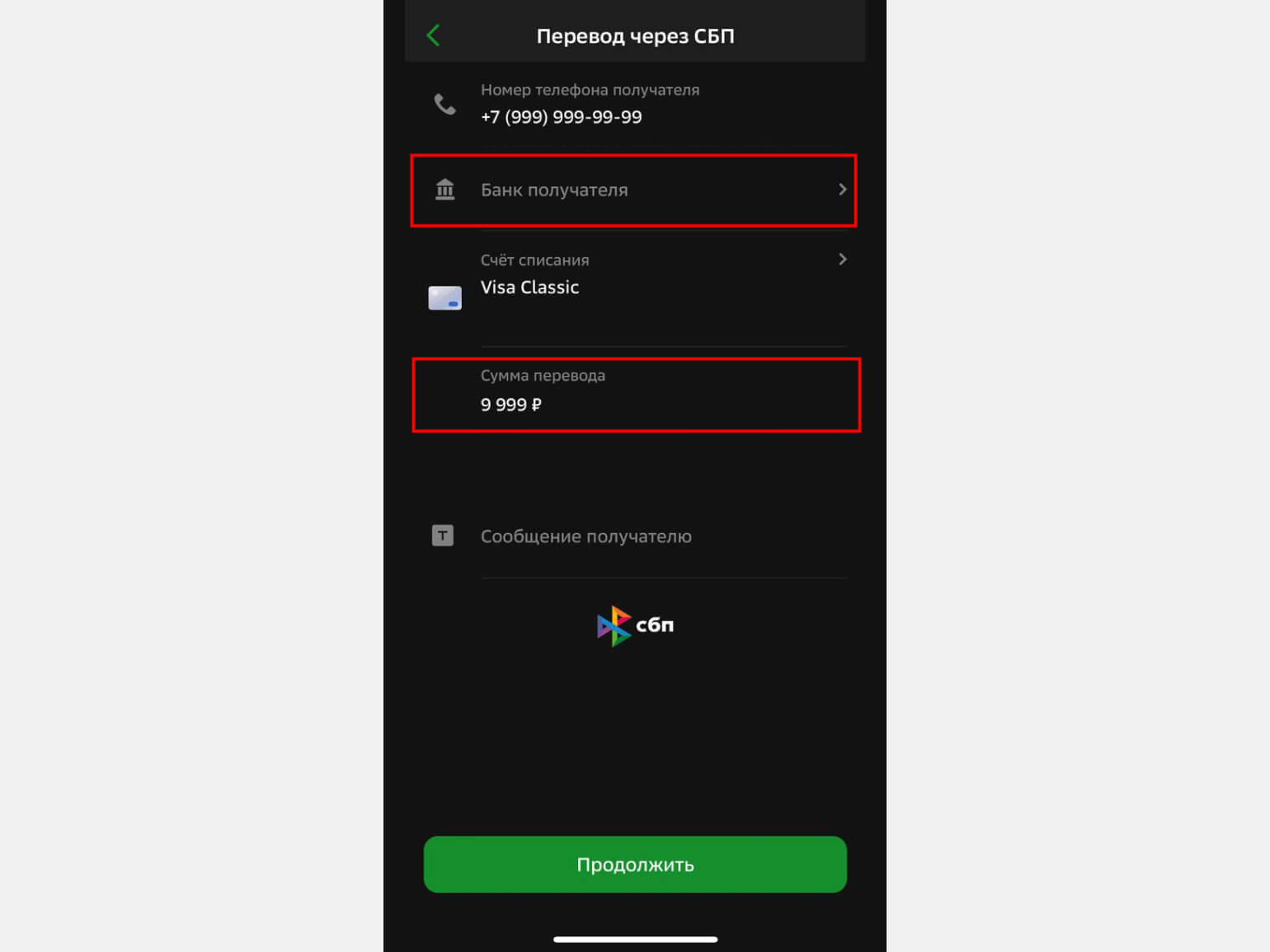 - Выберите вариант перевода «Через СБП».