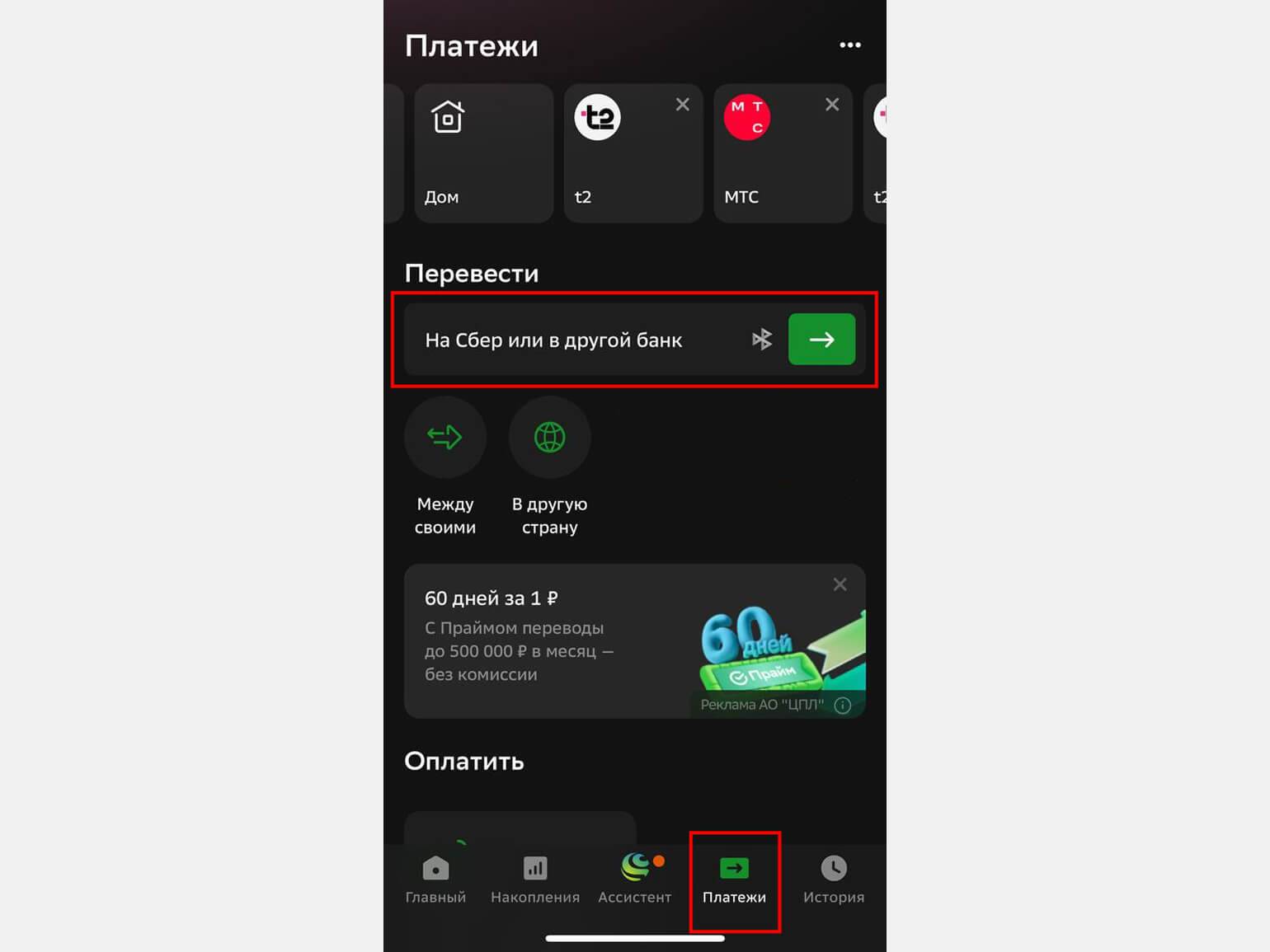 - Выберите пункт «Платежи» в меню в нижней части экрана.