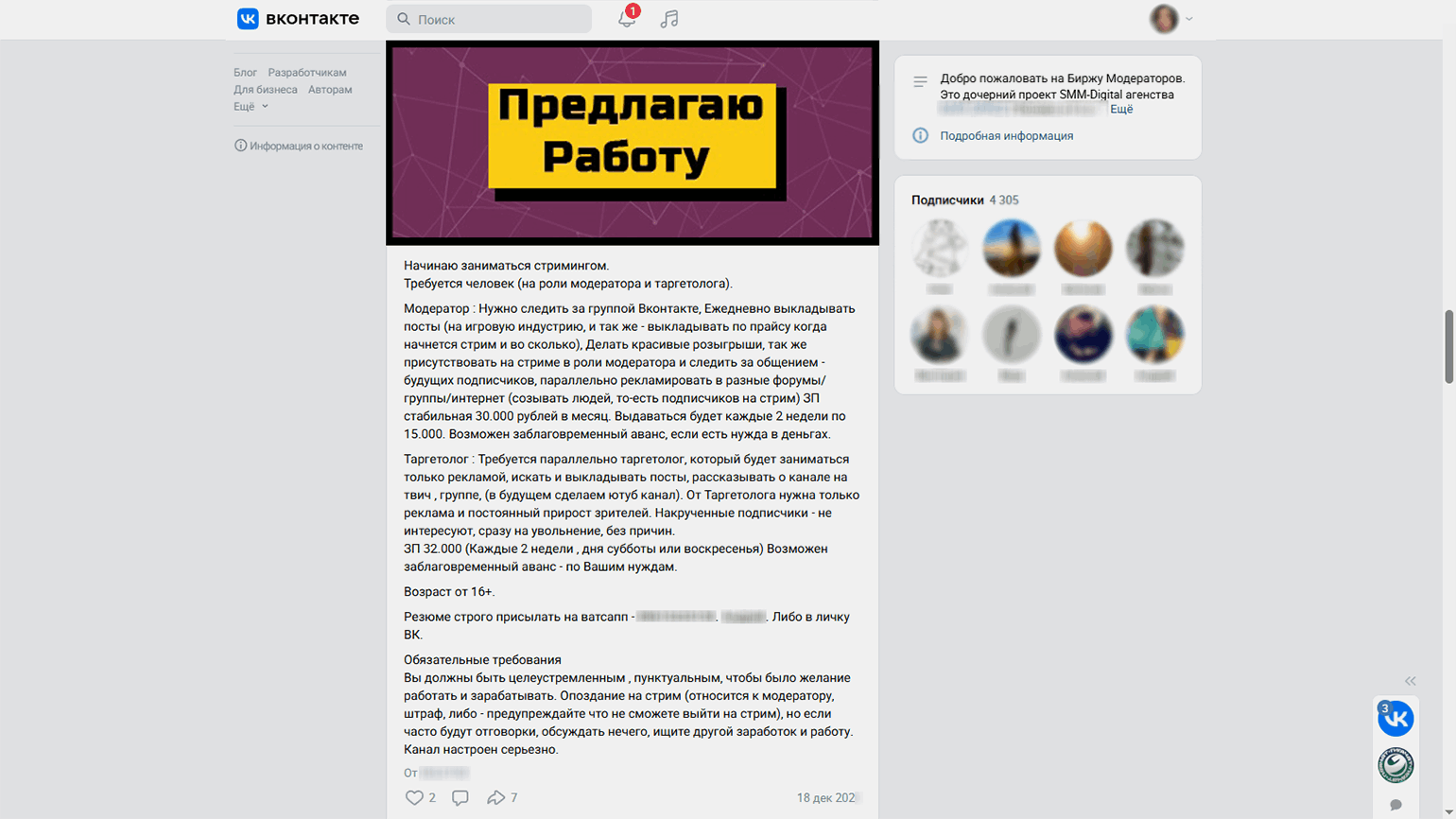 Скриншот: «Биржа модераторов/SMM/Контент менеджеров» / «ВКонтакте»