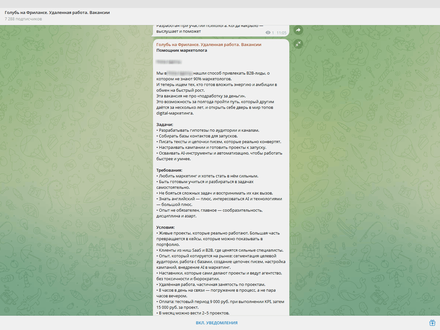 Скриншот: «Голубь на фрилансе. Удалённая работа. Вакансии» / Telegram