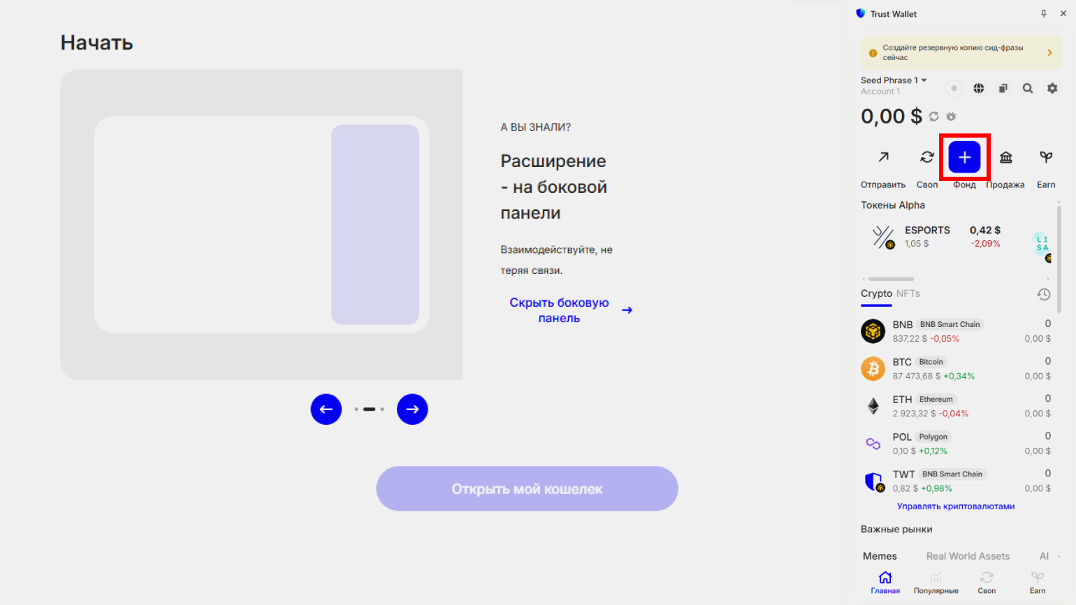 Чтобы сохранить сид-фразу, нужно найти и записать её. Сервис создаёт её автоматически после регистрации. В самом начале работы с расширением вы увидите уведомление «Создайте резервную копию сид-фразы сейчас» — оно подсвечивается бледно-оранжевым вверху рабочей зоны.