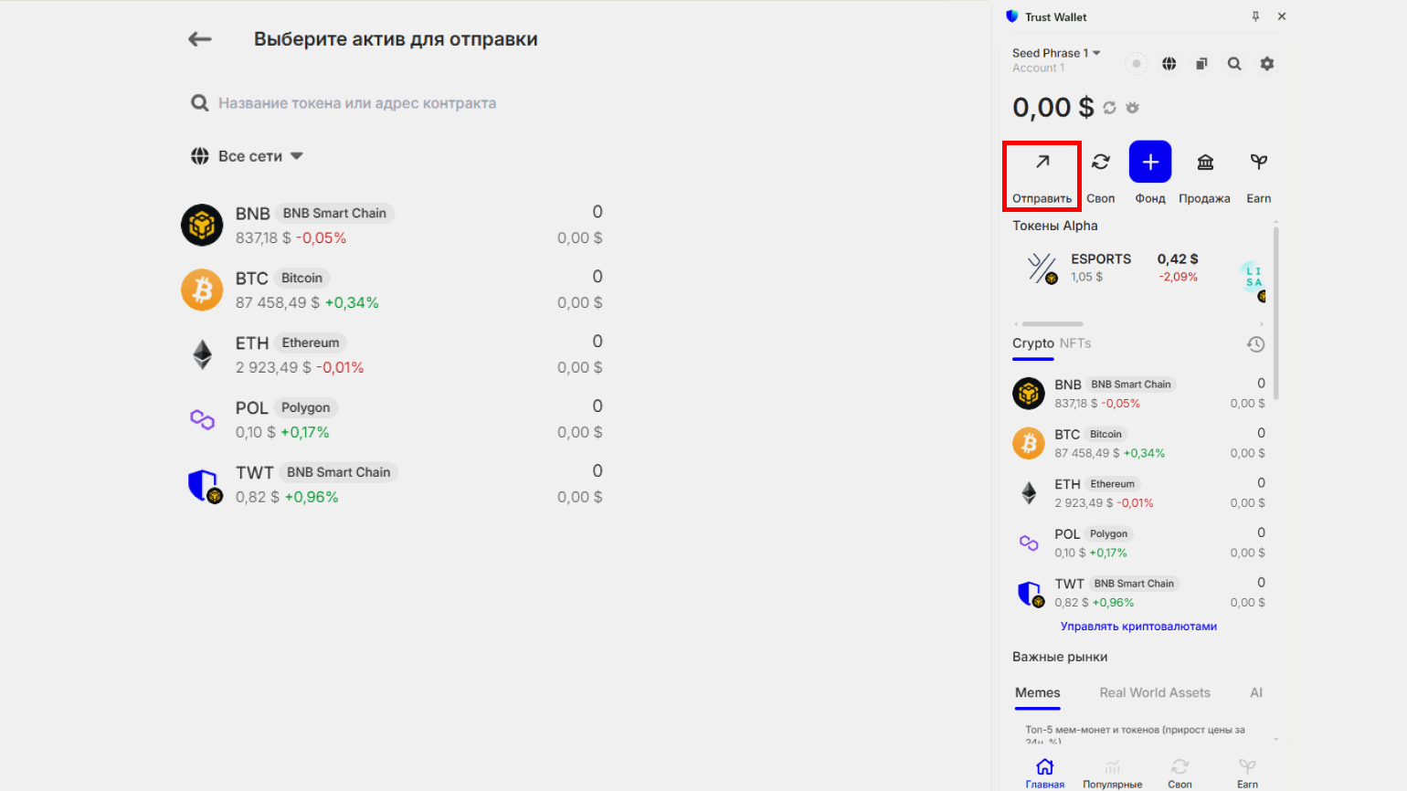 Чтобы отправить монеты в другой кошелёк, выберите кнопку «Отправить» с символом стрелки. Откроется список активов для отправки. Кликните по нужному активу, появится адресная строка — в неё нужно внести адрес кошелька-получателя.