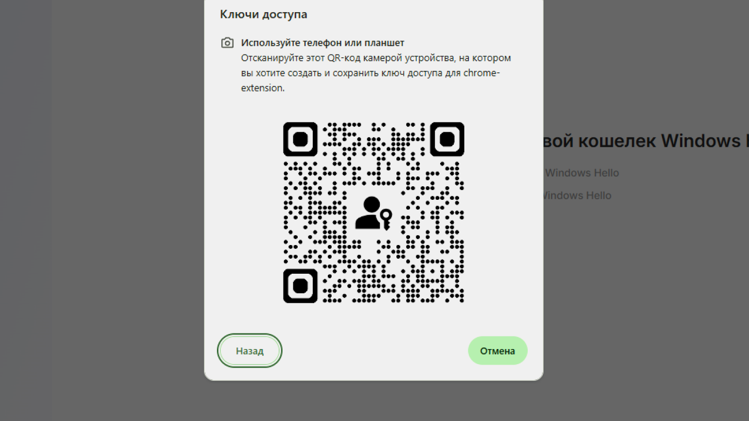 Пропустить шаг нельзя — нужно обязательно выбрать один из предложенных вариантов. Мы выбрали хранить пароль в браузере, чтобы показать, как работает сервис, но так лучше не делать: ключ будет более уязвим, чем при хранении в виде QR или внешнего электронного ключа.