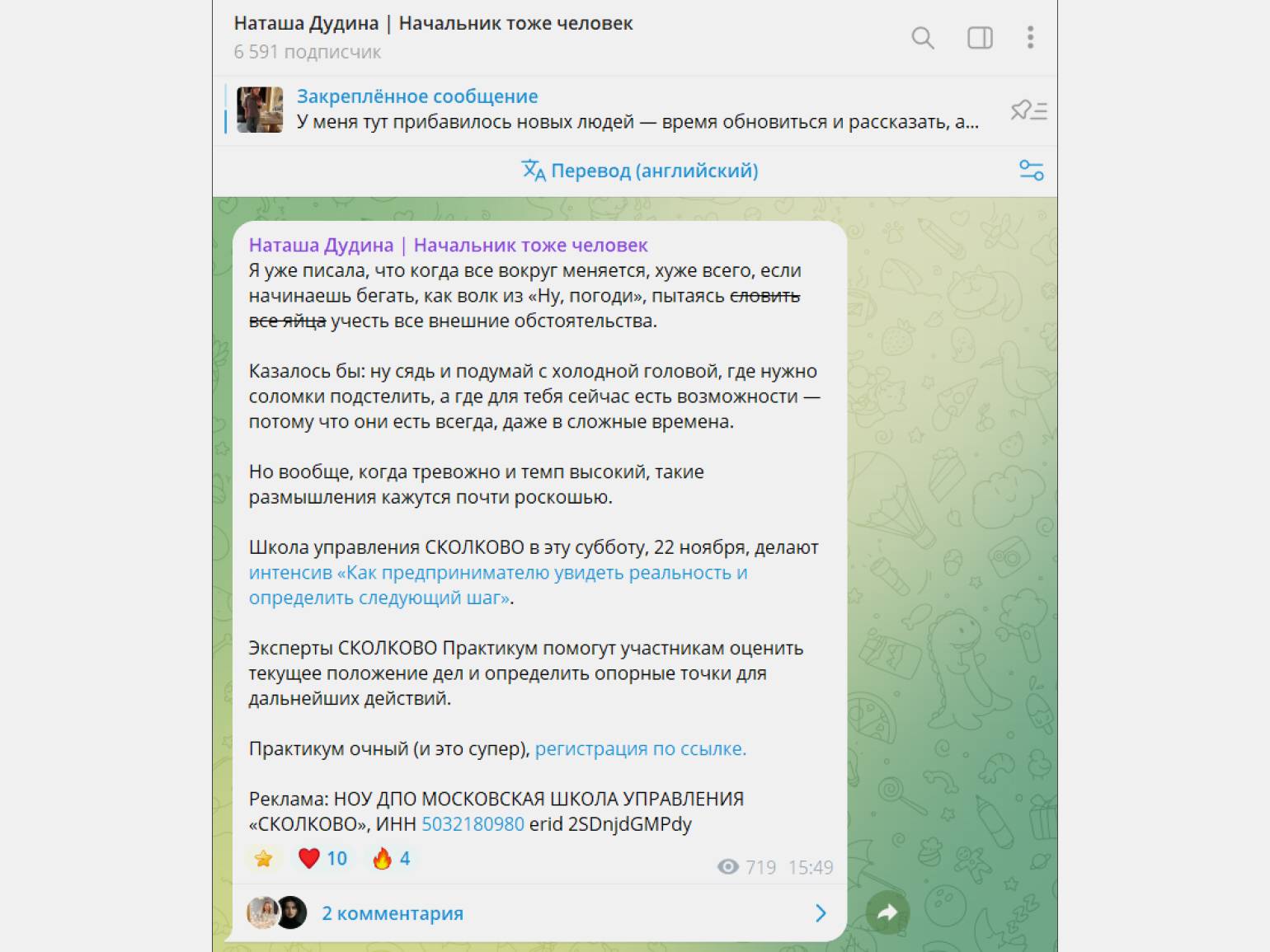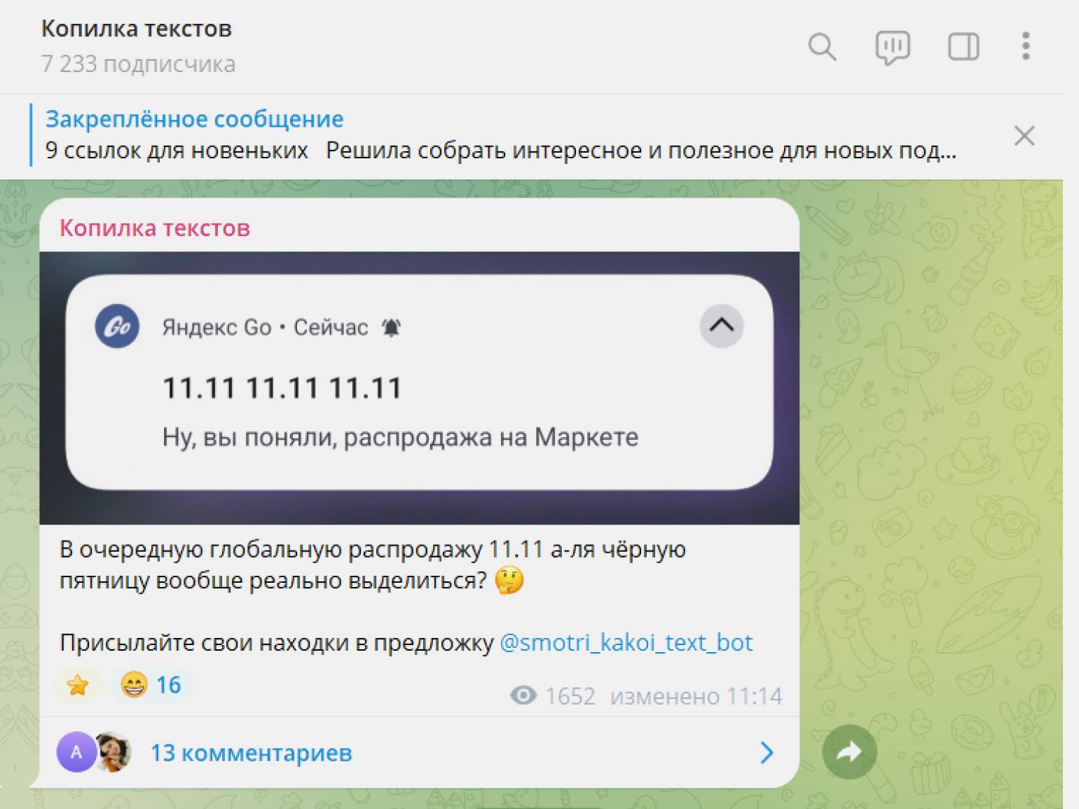 На цену также влияет ниша — например, в каналах про бизнес, инвестиции и маркетинг размещение обычно стоит дороже. Так, в канале «Молянов» на момент публикации статьи 24 400 подписчиков, а реклама стоит 37 000 рублей. В канале «Инструменты редактора Марфицина» про копирайтинг на 11 000 подписчиков рекламный пост стоит от 6990 до 9990 рублей.