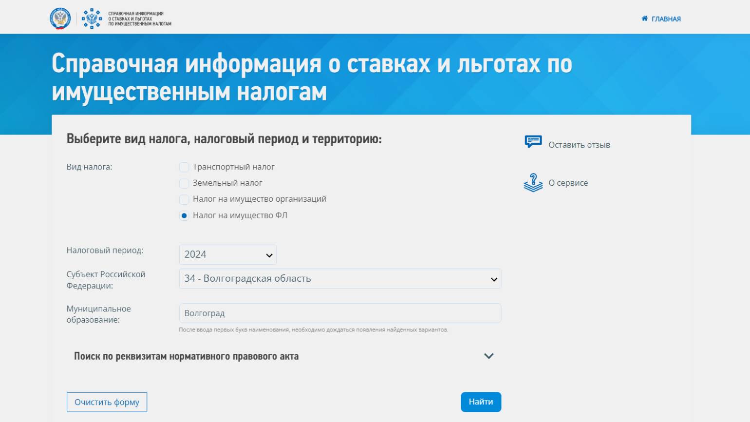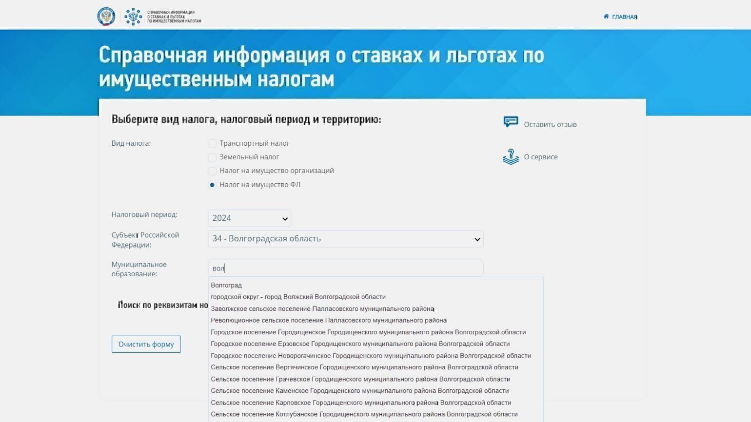 Для этого в форме на сайте справочного сервиса нужно выбрать вид налога, нужный регион и ввести первые три буквы названия населённого пункта в окно поиска. Из выпадающего списка выбрать нужный город или муниципальное образование и нажать на кнопку «Найти».