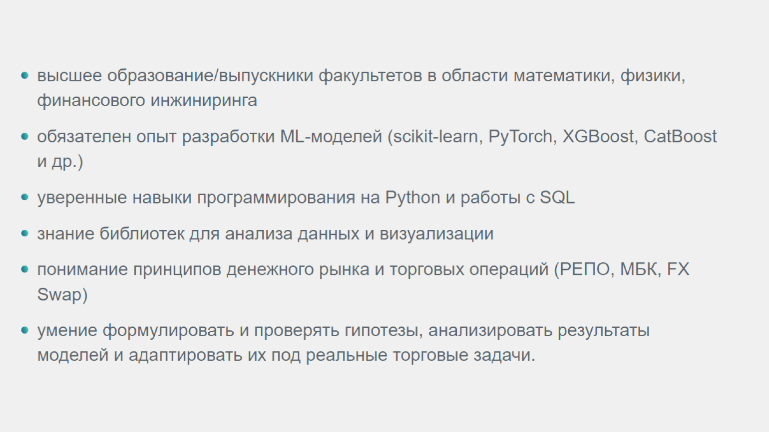 Навыки работы с ПО и алгоритмами — торговыми платформами, приложениями для анализа.