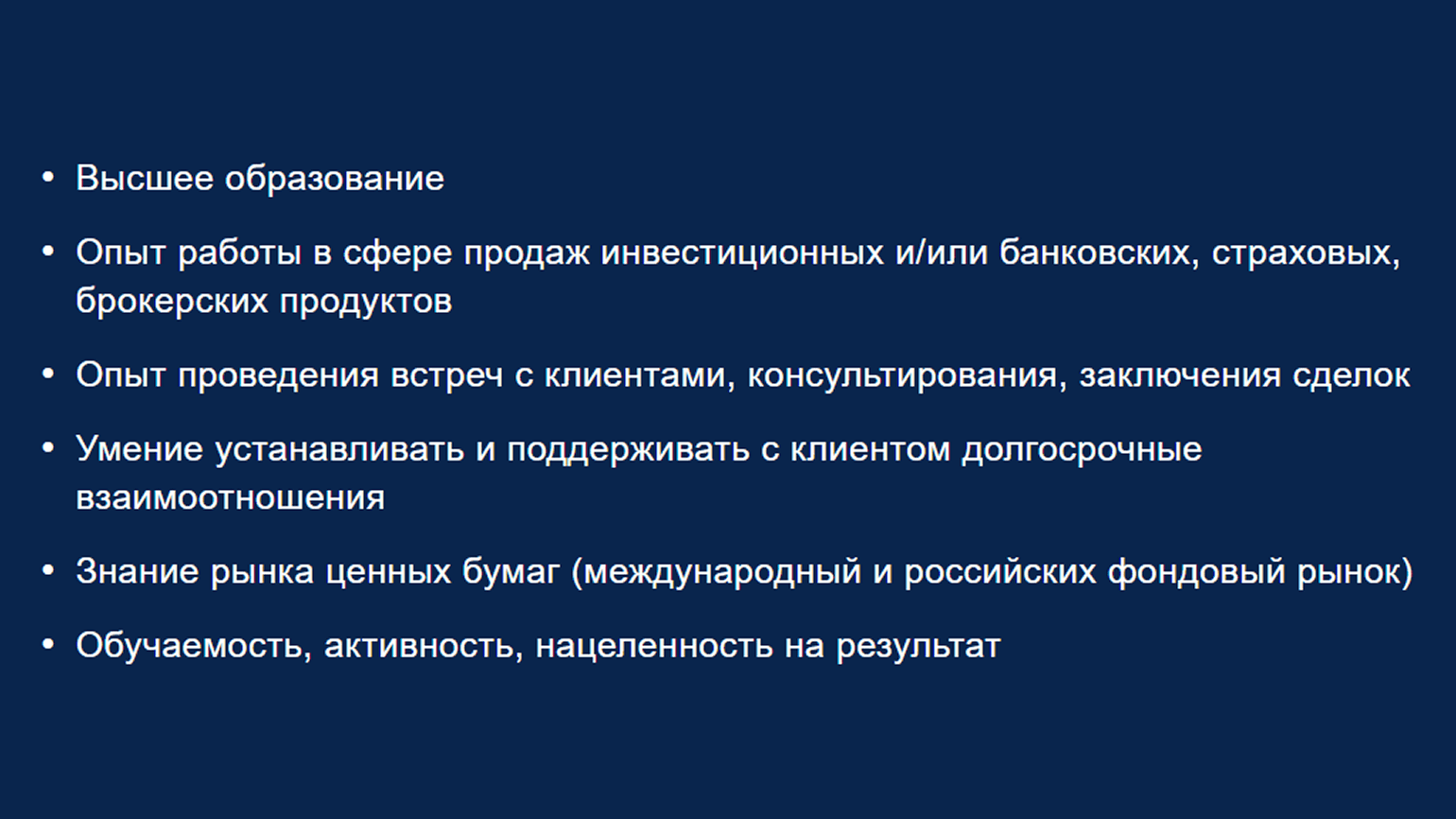 - Для работы в брокерской отрасли требуется финансовое или экономическое образование и/или статус квалифицированного инвестора. Для ряда должностей обязательно свидетельство о НОК (независимая оценка квалификации). Также специалистам нужны профессиональные навыки: знание рынков, аналитика, работа с ПО — и личные качества, такие как коммуникабельность, аналитическое мышление, стрессоустойчивость.