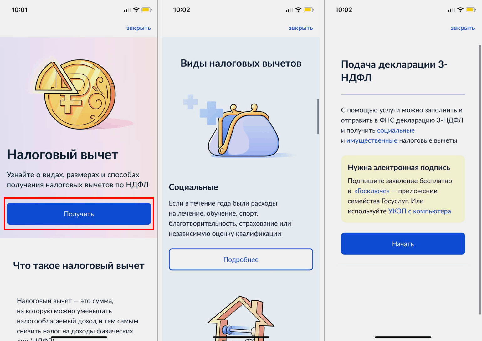 Можно сразу начать оформление налогового вычета, нажав на кнопку «Получить». Сервис предложит подать декларацию 3-НДФЛ. После этого нажмите «Начать» и следуйте инструкциям приложения.