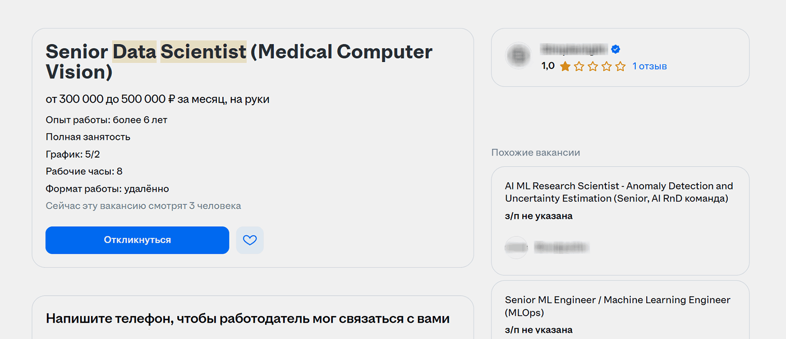 Средняя зарплата в вакансиях для новичков в этой области в январе 2026 года составляла 175 000 рублей, по данным HeadHunter. Опытные специалисты могут зарабатывать до 425 000 рублей в месяц. Размер оплаты зависит от глубины математической и технической подготовки, умения работать с ML-моделями, масштаба проектов и влияния на бизнес-результат.