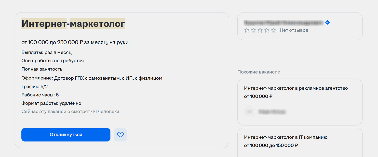 Средняя зарплата новичков в этой области в январе 2026 года, указанная в вакансиях, составляла 50 000 рублей по данным HeadHunter. Уровень заработка интернет-маркетологов зависит от их специализации (например, performance, SMM, контент, аналитика), умения работать с метриками и рекламными бюджетами, опыта в разных нишах и влияния на бизнес-результат.