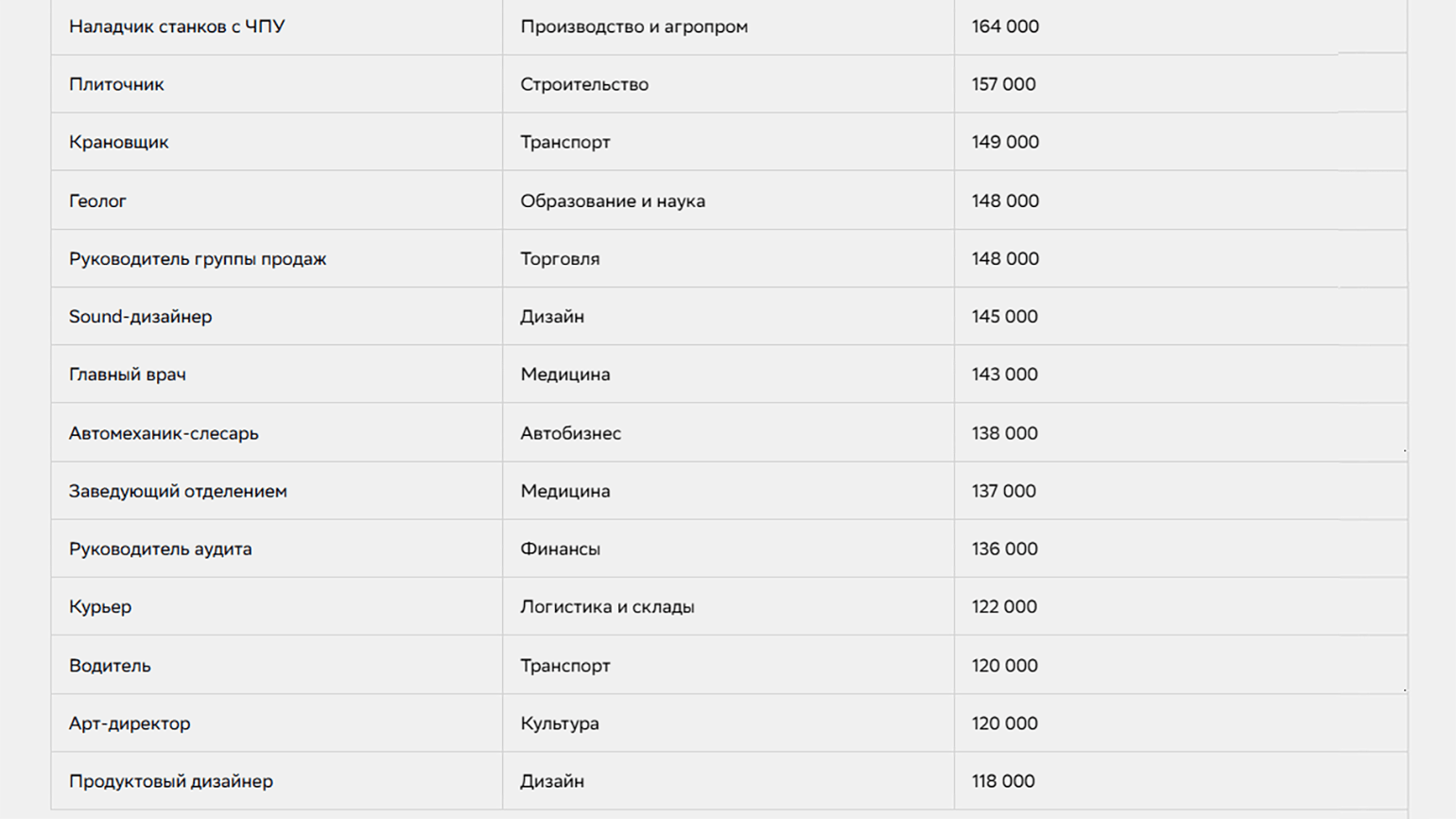Транспорт. В этой отрасли зарплата напрямую зависит от нагрузки, графика и готовности к длительным разъездам: чем сложнее техника и дальше маршруты, тем выше заработок. Например, водители зарабатывают около 120 000 рублей, крановщики — 149 000 рублей, а водители-дальнобойщики — 175 000 рублей в месяц.