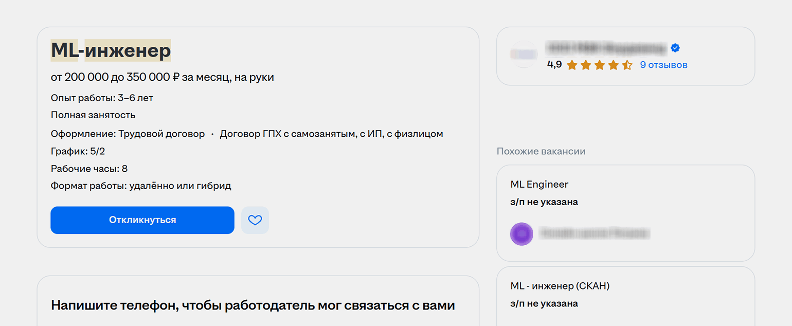 Средняя зарплата специалистов — 225 000 рублей в месяц, по данным «Хабр Карьеры». Уровень дохода зависит от глубины экспертизы в машинном обучении, опыта продакшен-внедрений, владения языками программирования и фреймворками, а также масштаба задач.