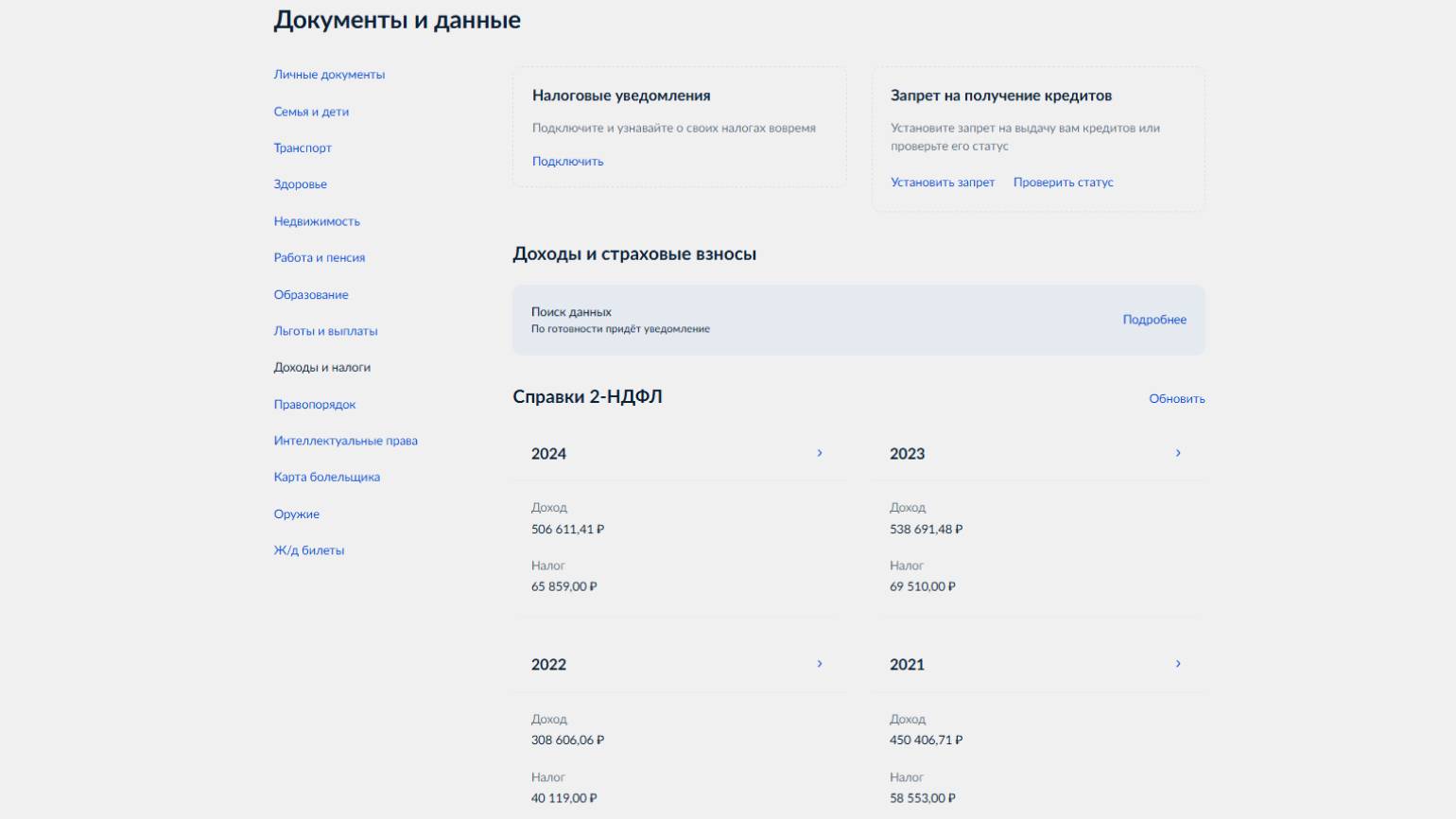 Нужно кликнуть по активной области «Справка о доходах 2-НДФЛ» — откроется раздел «Документы и данные». Ниже на странице будет раздел «Справки 2-НДФЛ», в котором доступны документы за последние годы. Если справок нет, система предложит запросить их за последние три года.