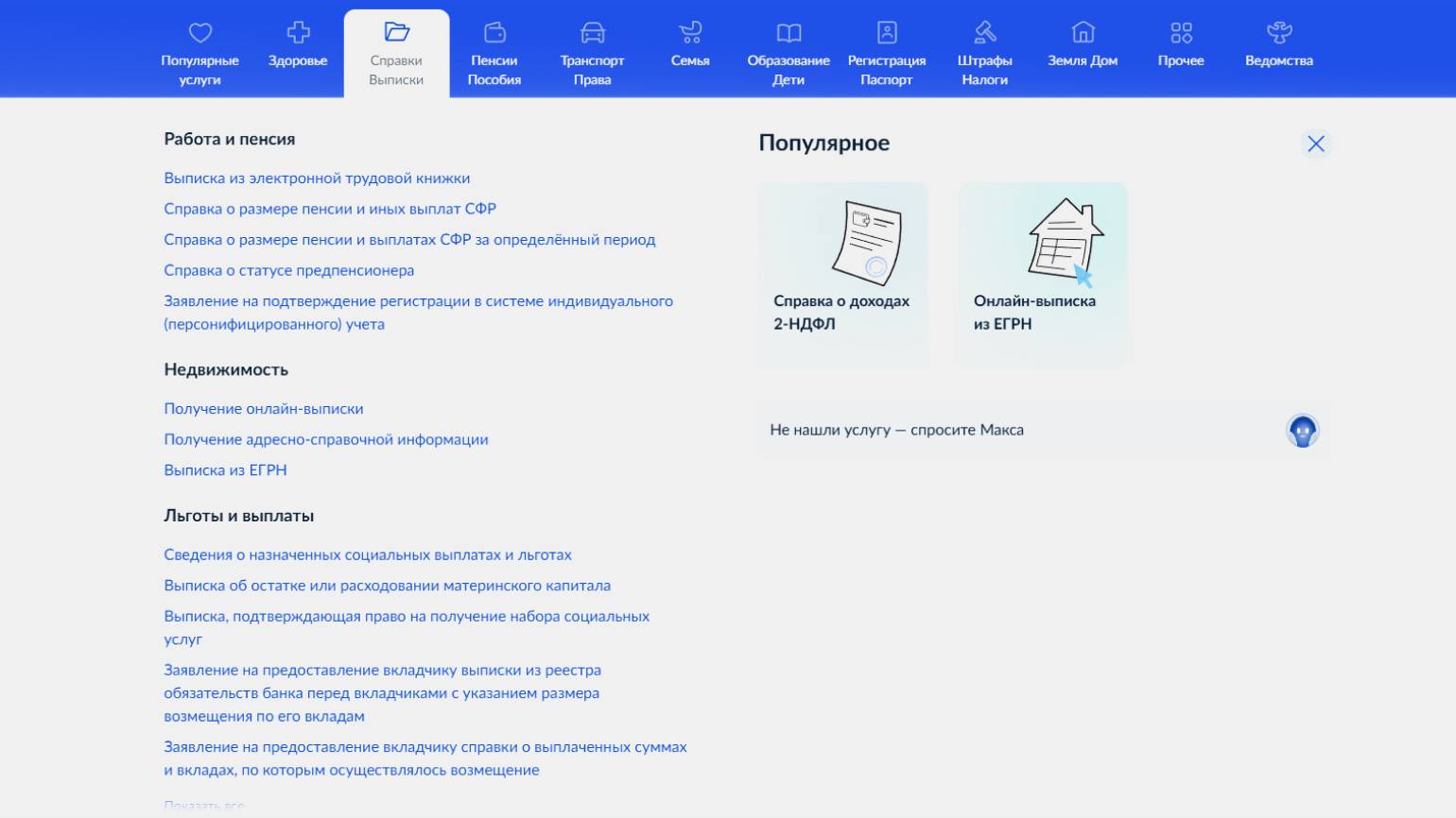 На главной странице нужно выбрать вкладку «Справки, Выписки». Справка о доходах 2-НДФЛ выделена в отдельной зоне раздела «Популярное» в правой части экрана.