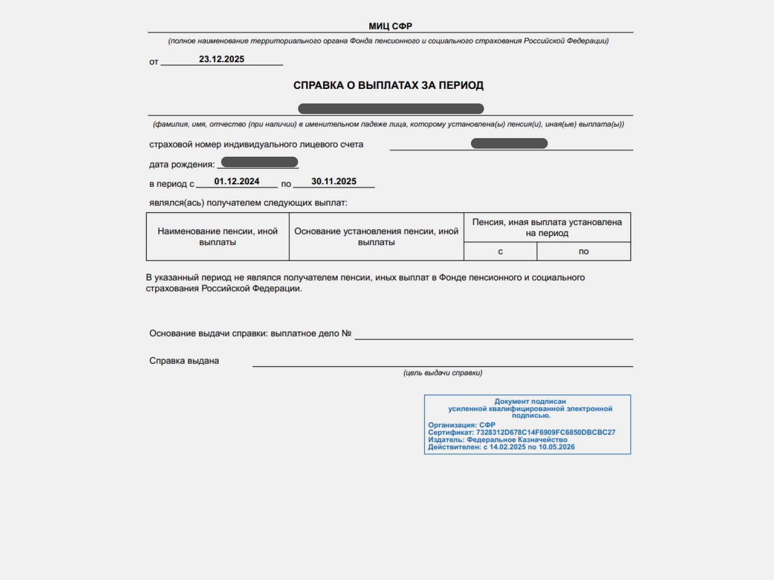 Справка о произведённых выплатах из СФР. Справку можно получить в СФР лично или онлайн на «Госуслугах». Документ содержит сведения о том, получал ли человек пенсию, пособия или иные выплаты из СФР за определённый период.