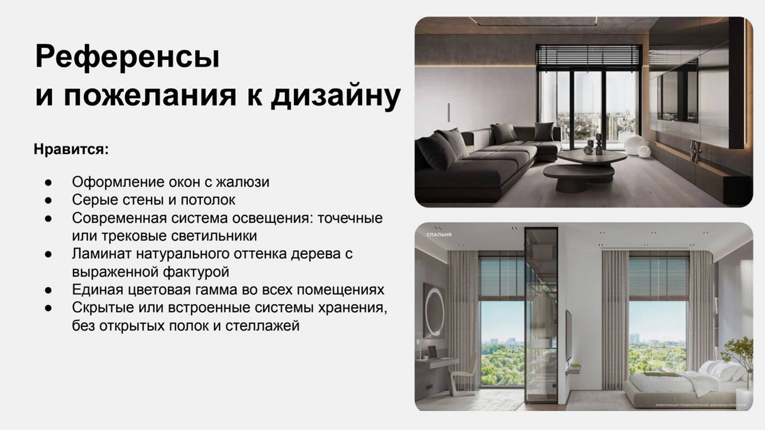 На встрече Павел и Олеся поделились документом с требованиями и особенностями помещения. Среди прочего отметили, что будущая хозяйка квартиры — любительница минимализма и работ архитектора Захи Хадид. Поэтому квартира должна быть лаконичной, без визуального шума, с минимумом открытого хранения. Цвета в интерьере должны быть сдержанными, без ярких акцентов. Для большей наглядности заказчики поделились референсами.