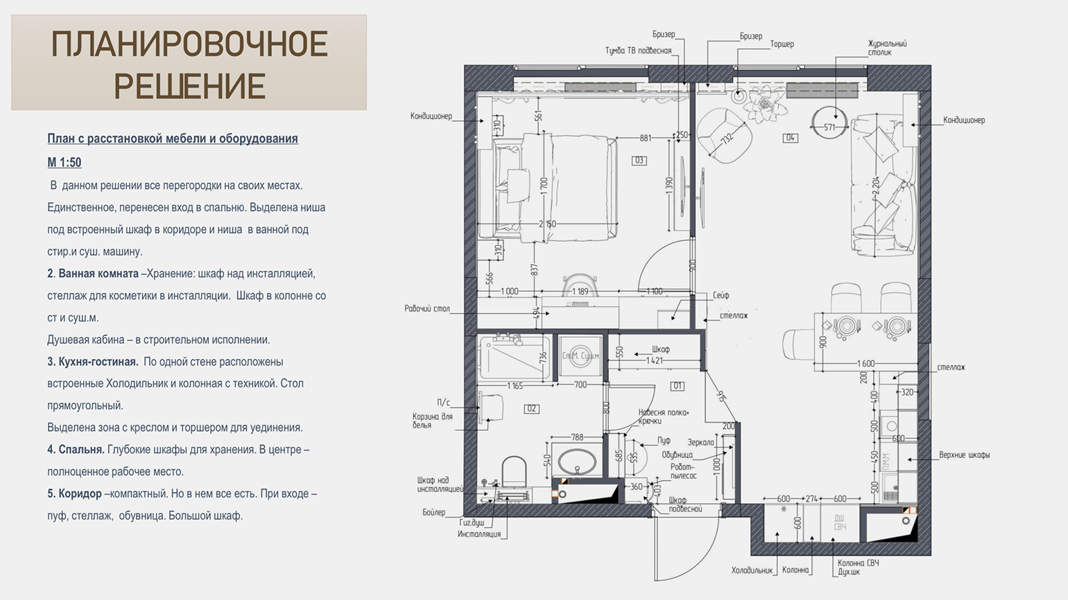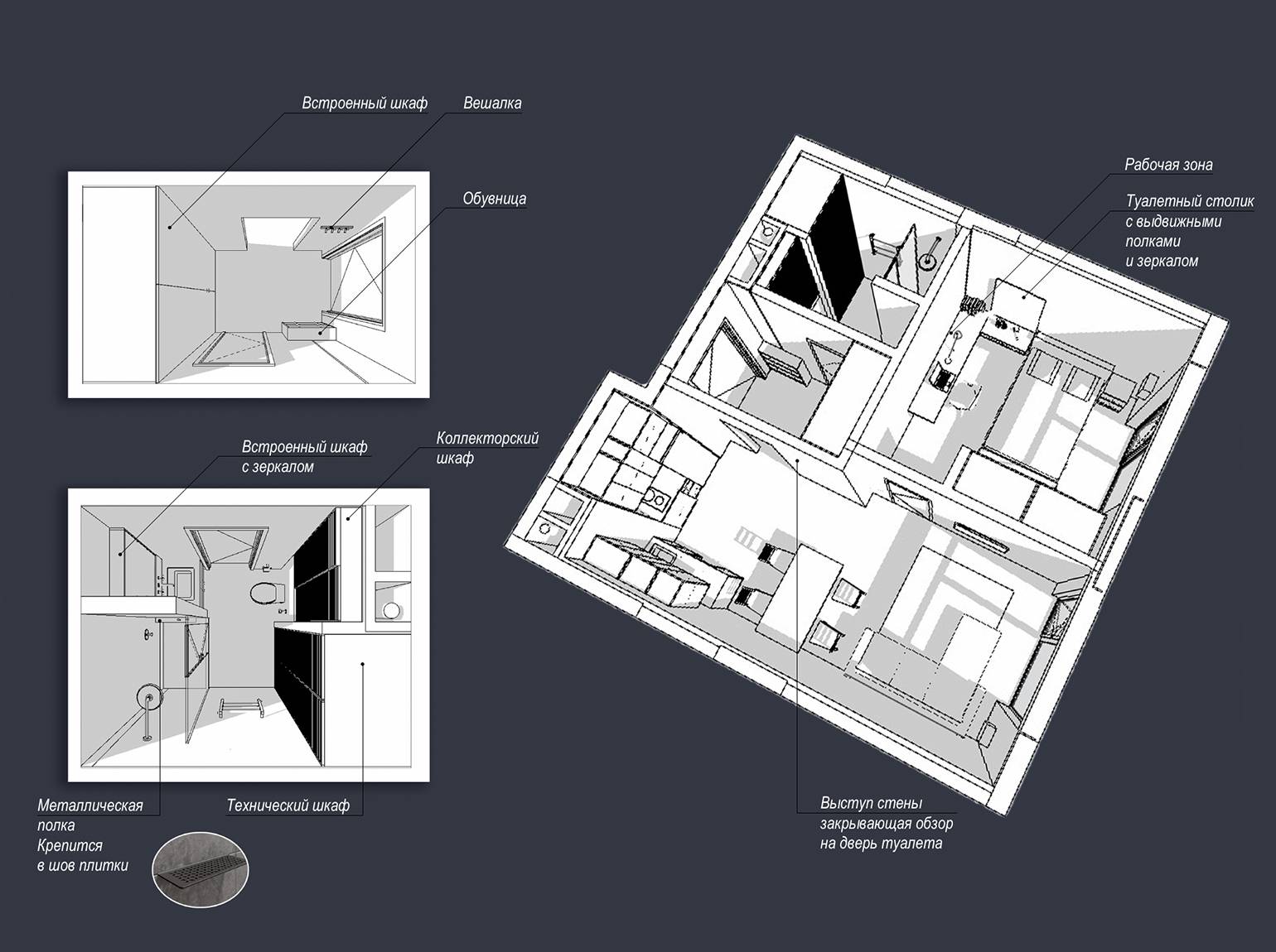 Среди важных пожеланий — вписать в ванную комнату стиральную и сушильную машины, кухню сделать небольшой, потому что студентка не будет посвящать много времени готовке, и обязательно обустроить рабочее место для учёбы.
