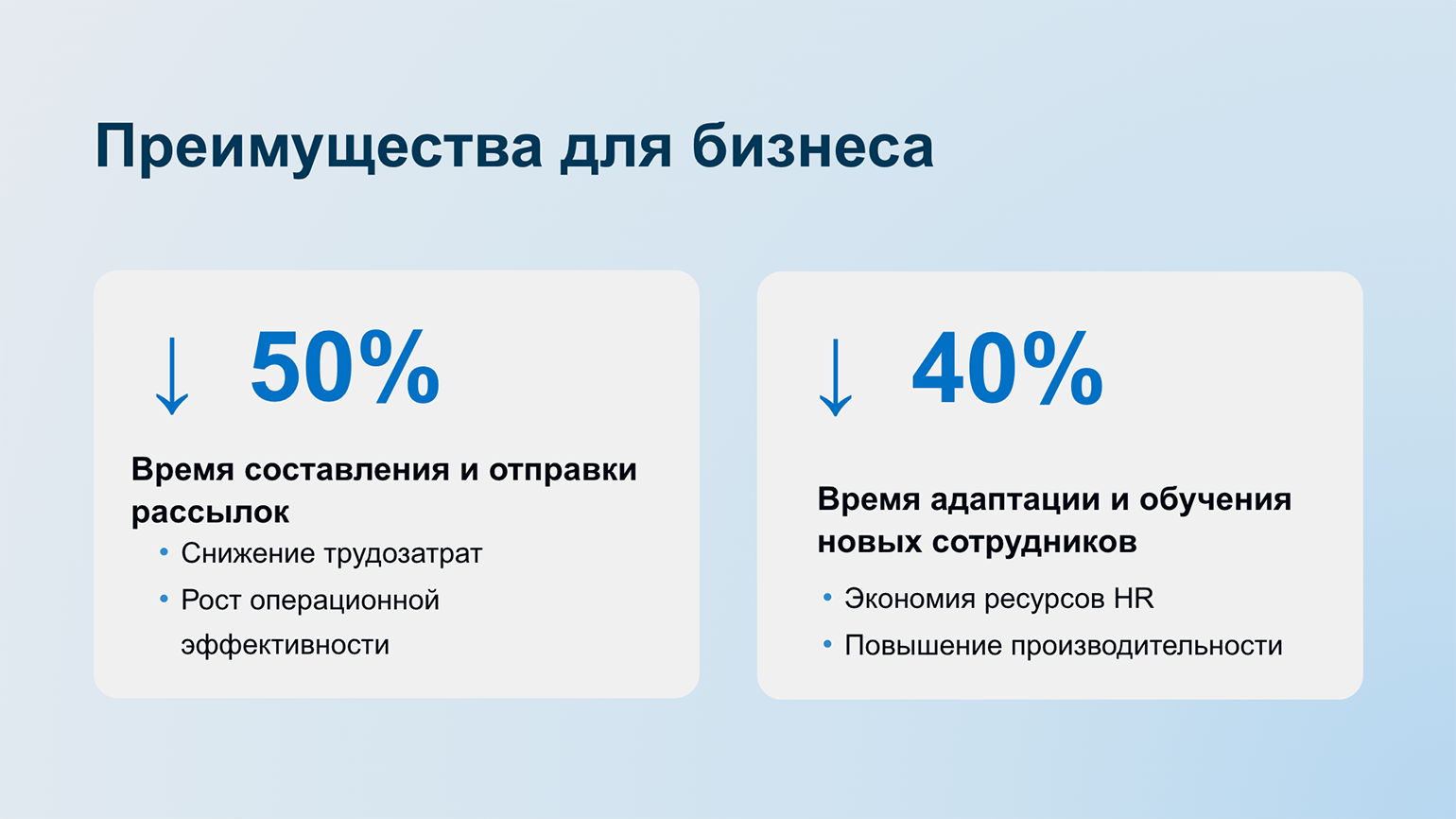Команда протестировала продукт и убедилась, что MailFrame помогает создавать и отправлять рассылки вдвое быстрее, чем было изначально. А ещё позволяет новым сотрудникам компании адаптироваться на 40% быстрее.