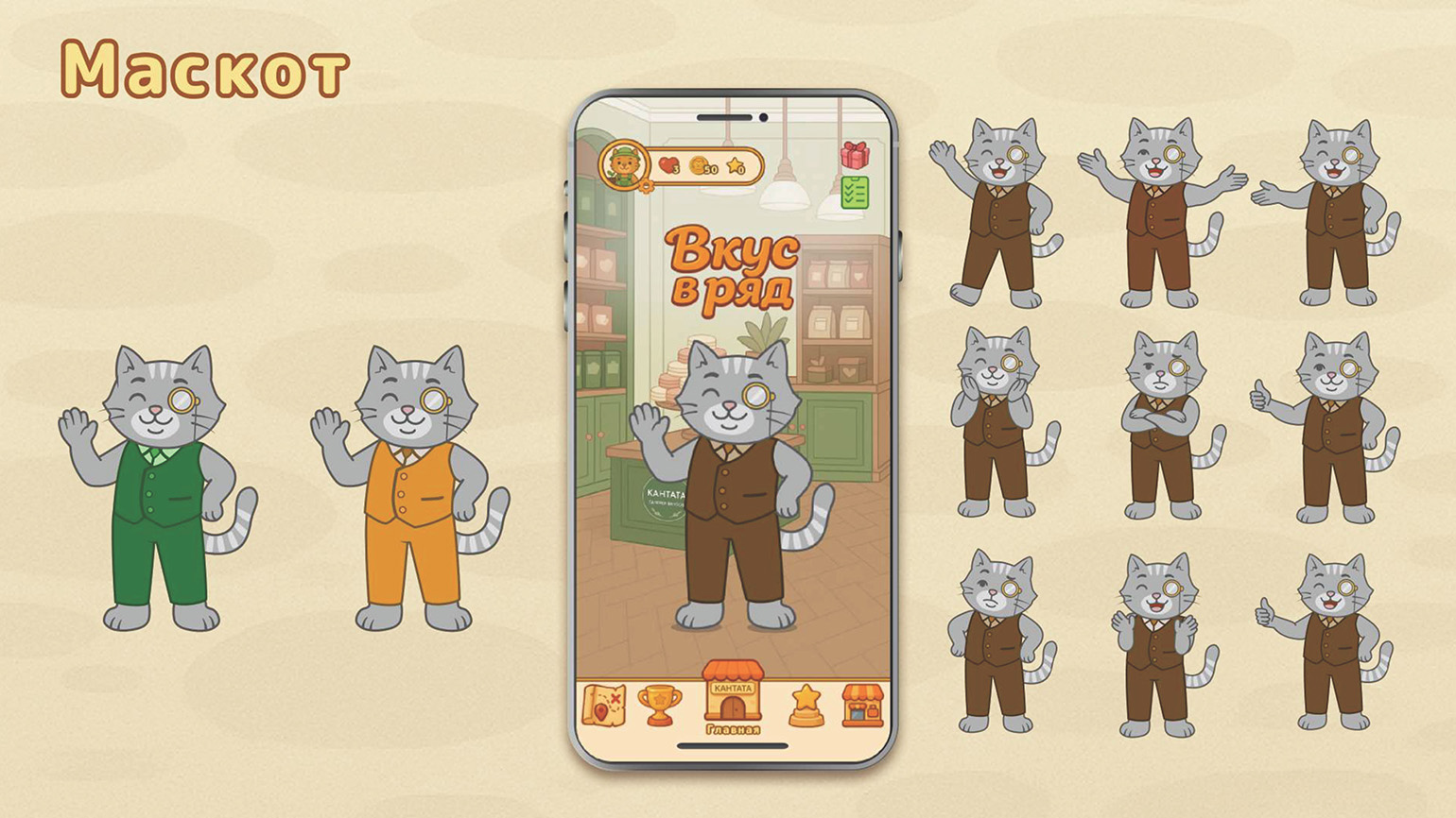 Финальным решением стало адаптивное веб-приложение с игровой механикой «вкус в ряд» — вариацией жанра «три в ряд», адаптированной под ассортимент и стилистику «Кантаты». Механика строится вокруг знакомства с продуктами бренда: пользователь проходит уровни, собирает комбинации и постепенно открывает позиции компании в ненавязчивом игровом формате.