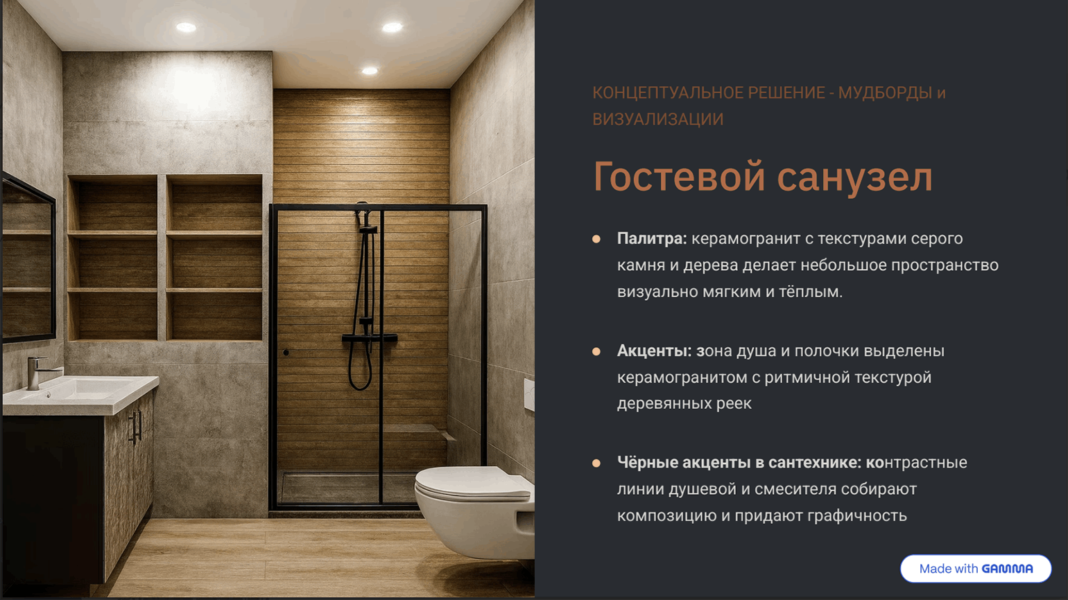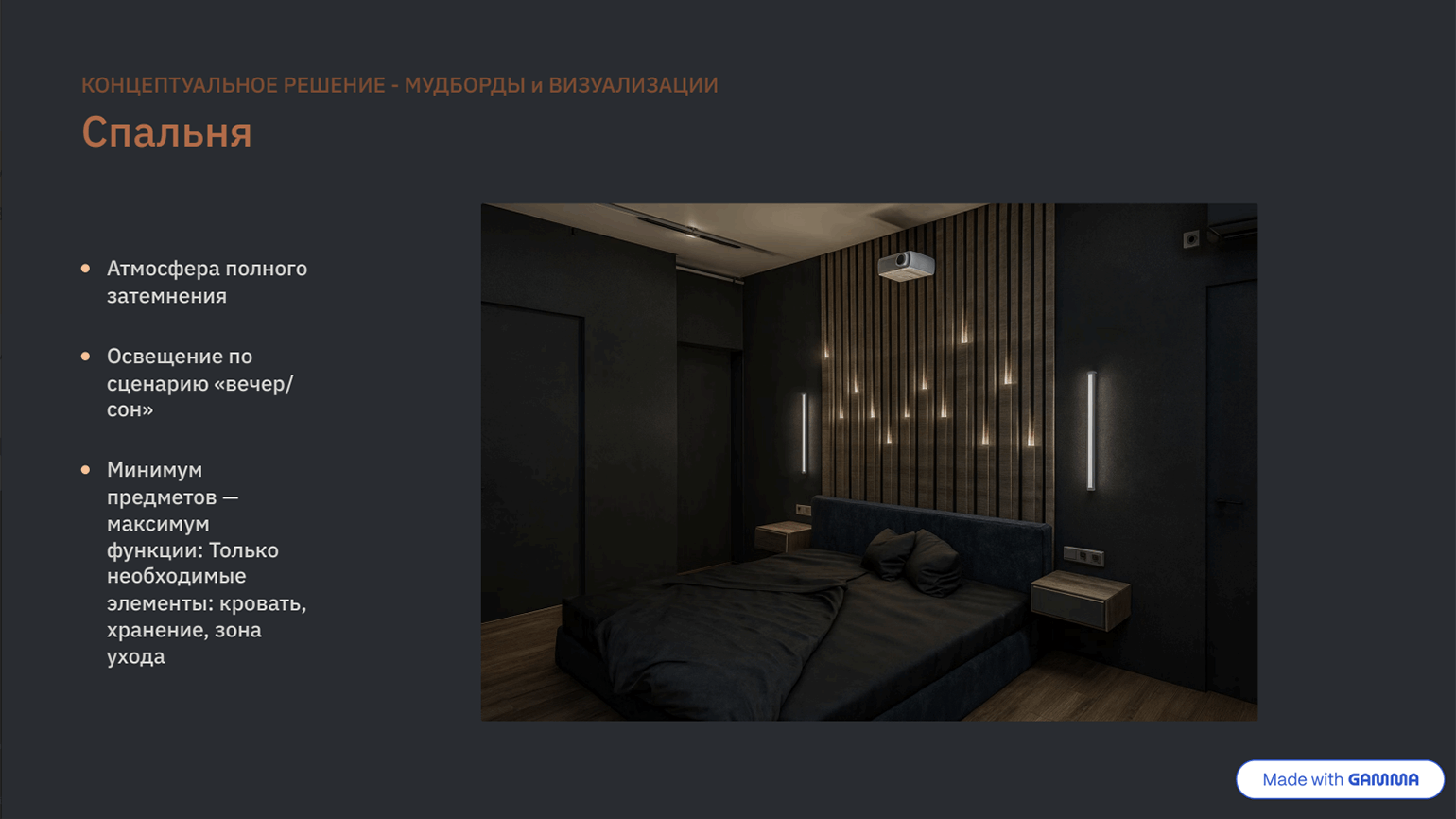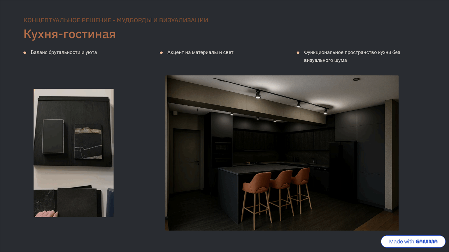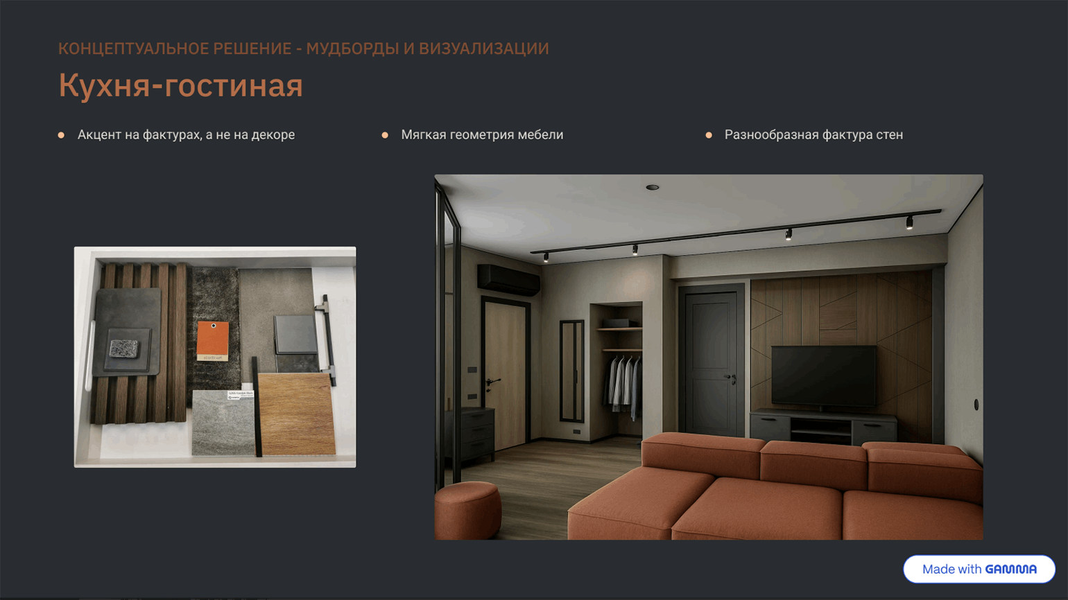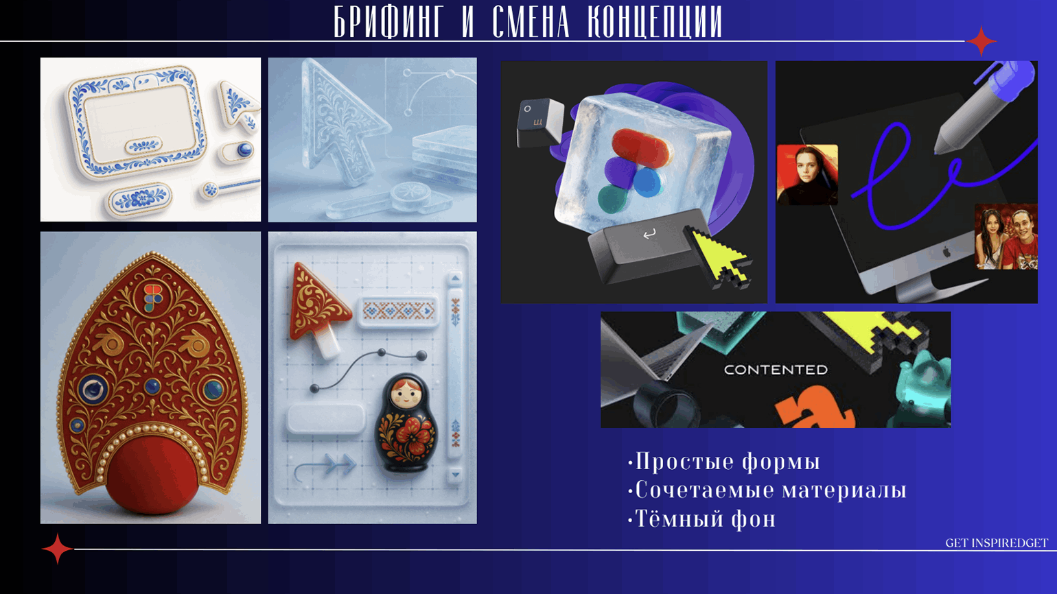 Сначала студентка вдохновлялась знакомым многим образом — уютным Новым годом у бабушки: мандарины, ковры на стенах, семейное застолье. Но после брифинга с организаторами сменила концепцию на более современную и лаконичную, сделав ставку на простые формы, тёмный фон и сочетаемые материалы. Дополнительным источником вдохновения стал фирменный стиль школы Contented с его чёткой геометрией.