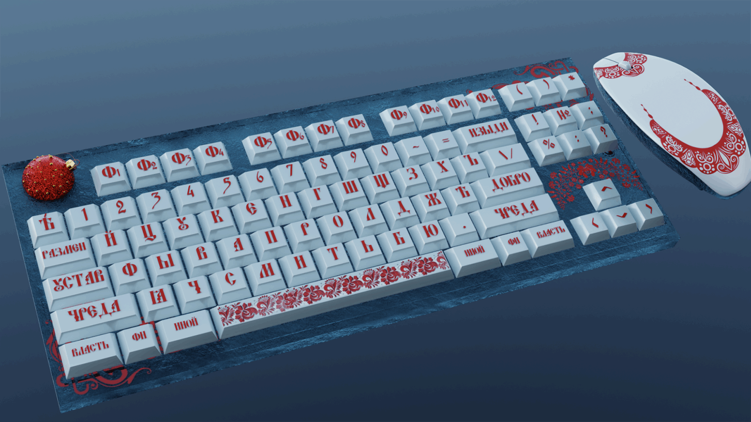 На этом Анастасия не остановилась. Вдохновившись хохломой, она перенесла традиционный орнамент на клавиатуру, а на мышь добавила узор в форме кокошника — его силуэт идеально повторил форму гаджета. В качестве кейкапа студентка использовала ёлочный шар, чтобы поддержать новогоднюю тему. Названия служебных клавиш — Shift и Enter — она тоже переосмыслила, переведя их на старославянский манер: «Чреда», «Добро».