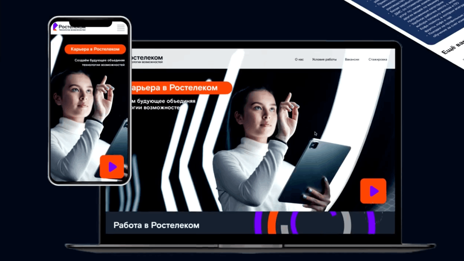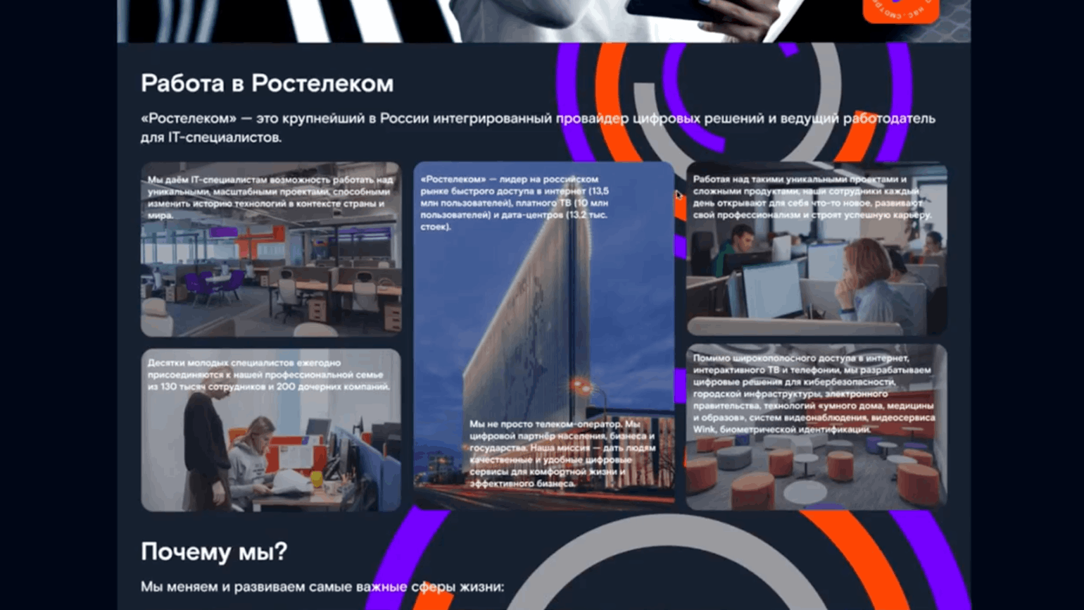 Первой в блоке по диджитал-дизайну выступила студентка курса «Веб-дизайн 3.0» Татьяна Снигирова. Она представила итоговый проект для реального заказчика — «Ростелекома». Перед Татьяной стояла задача через дизайн показать, что компания не только занимается телекоммуникациями, но и является крупным IT-холдингом. А ещё — разрушить стереотип о том, что большая корпорация неизбежно связана с бюрократией.
